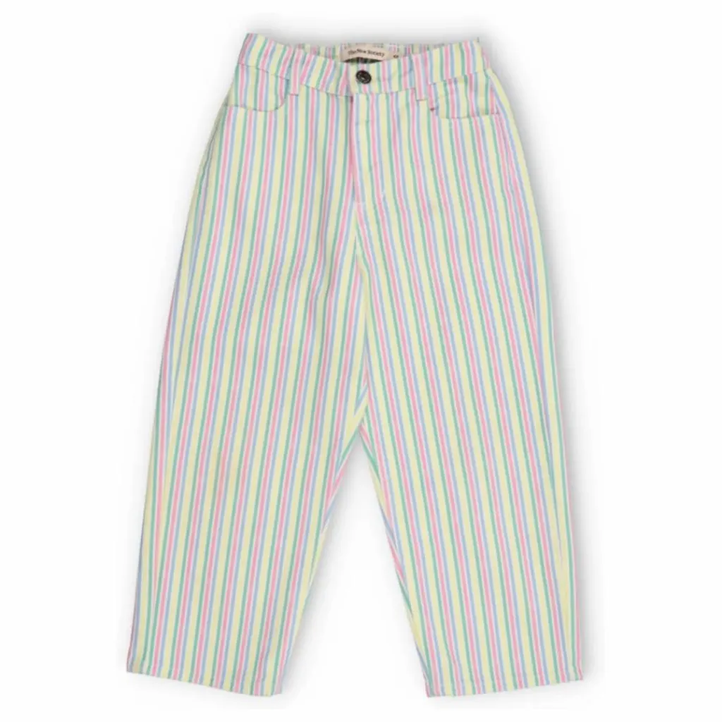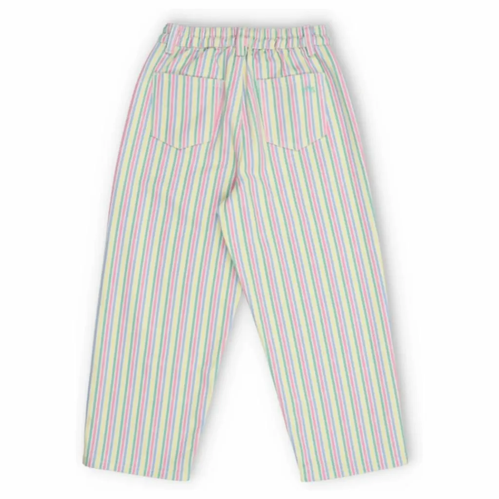 - Pantalon en denim avec un imprimé de rayures multicolores colorées et une ceinture élastique à l’arrière.