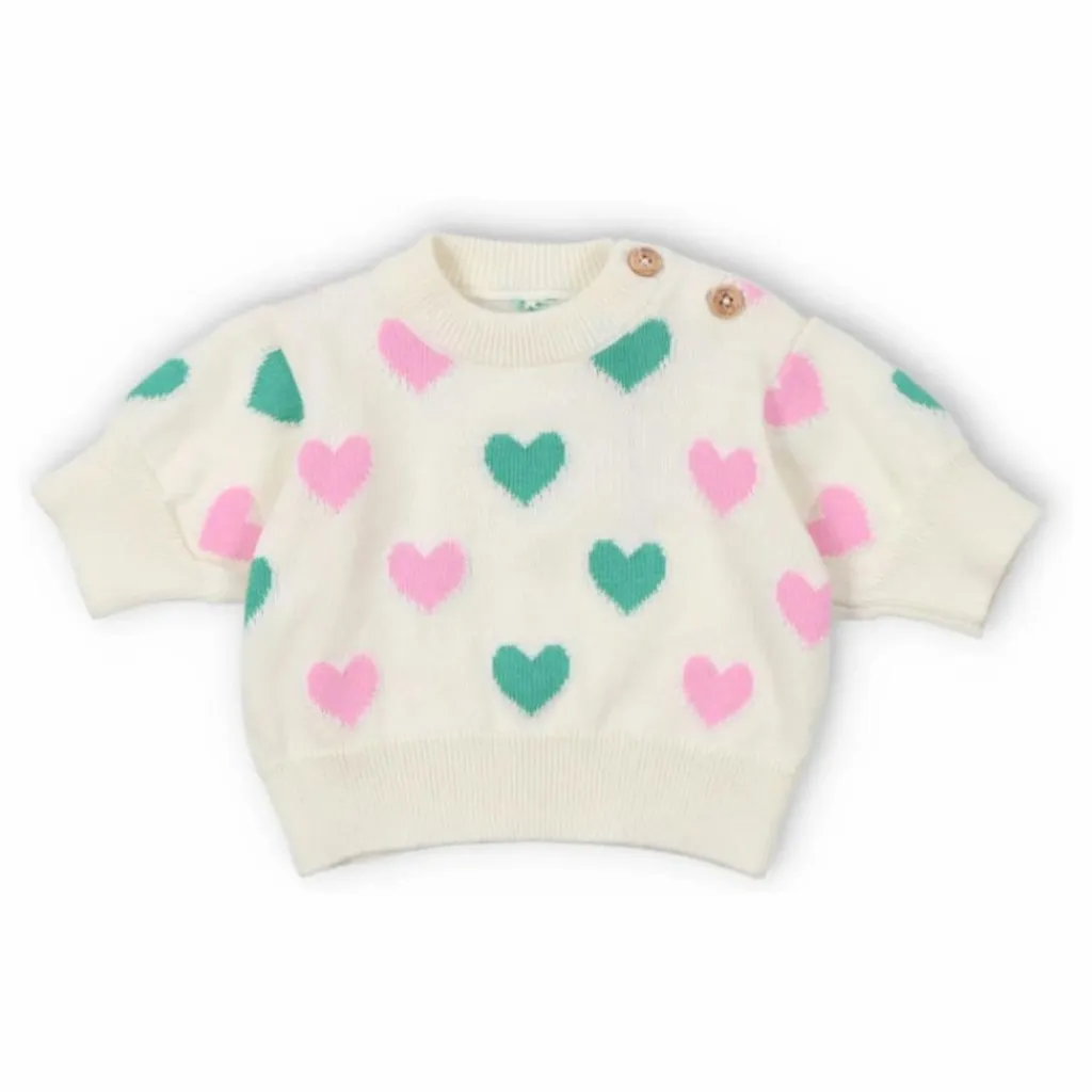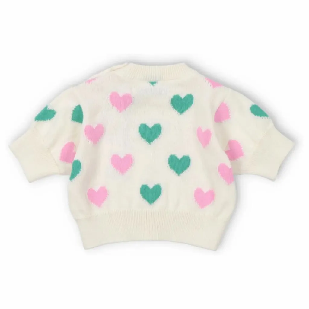 - Top en tricot avec un motif intarsia en forme de cœur ludique et une encolure, des poignets et un ourlet côtelés. Il est accompagné d’un short assorti pour créer un look estival parfait.