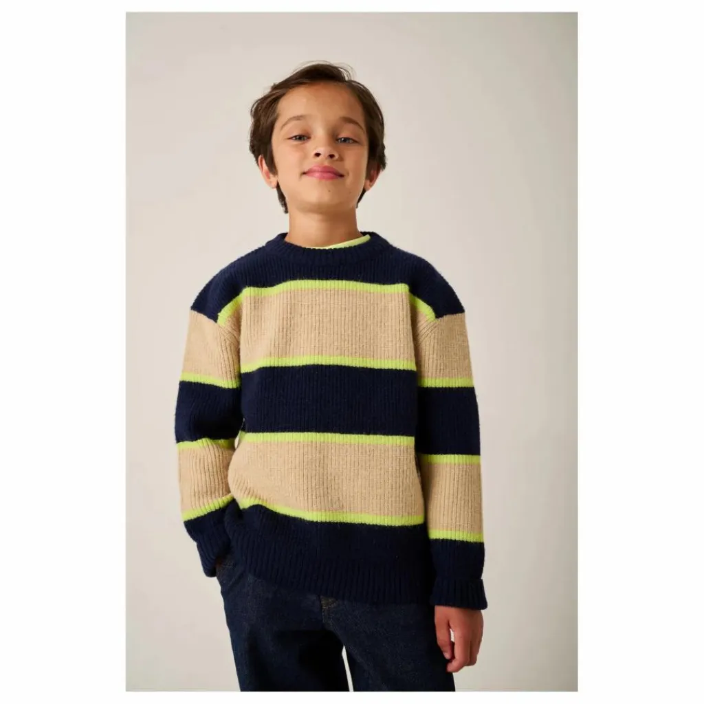 - Ce pull doux en tricot présente un motif à rayures multicolores et des poignets côtelés robustes.