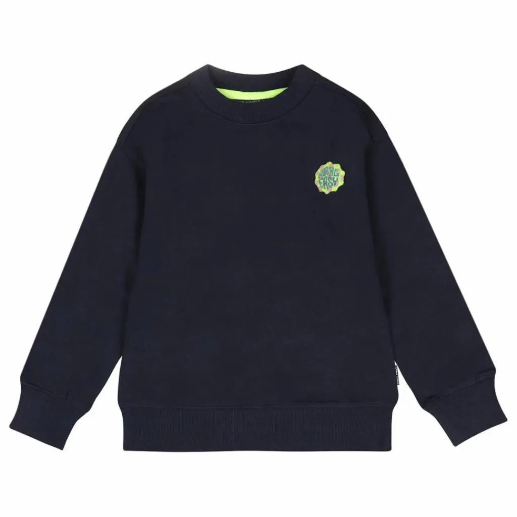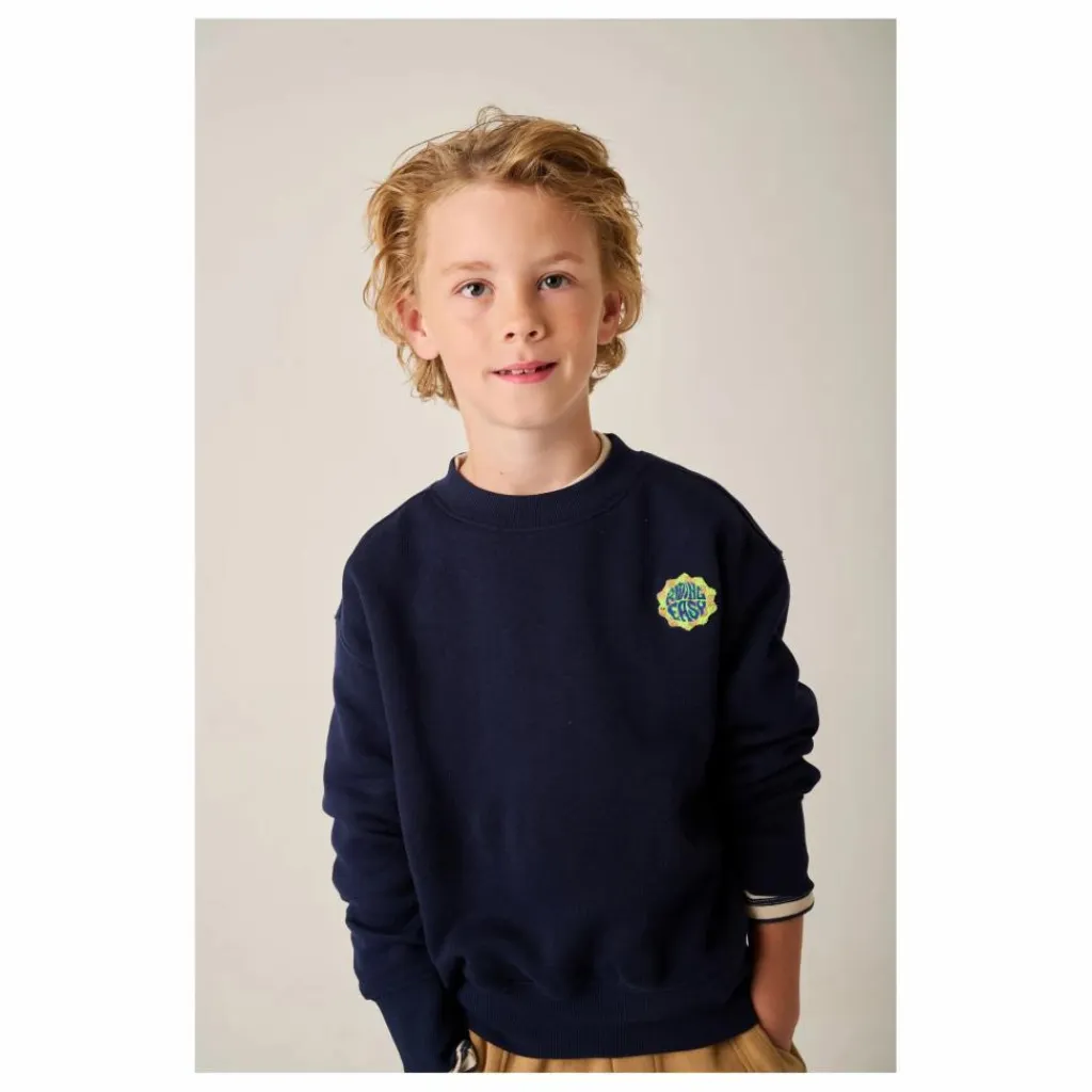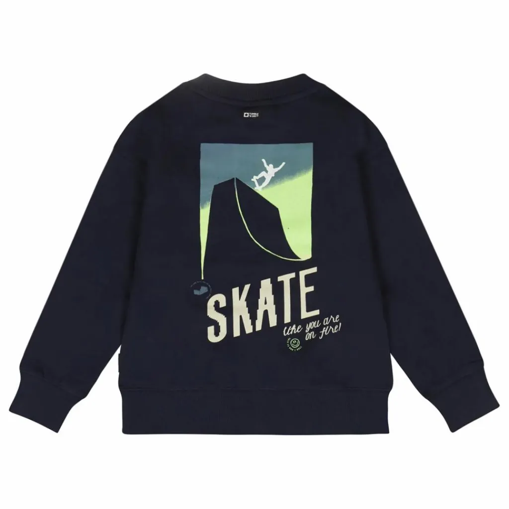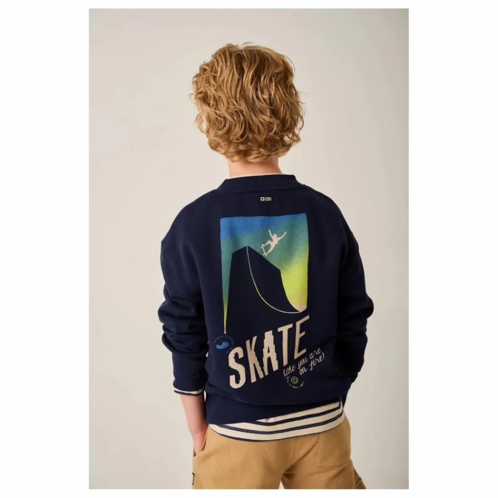 - Ce pull bleu foncé pour garçon allie confort et design cool. Le dos présente une impression graphique frappante d’un skateboard, tandis qu’un petit écusson assorti sur la poitrine ajoute une touche ludique. Fabriqué en 100 % coton biologique, il est en tissu éponge doux et brossé. La coupe régulière et les poignets côtelés assurent un ajustement confortable et font de ce pull un vêtement idéal pour tous les jours.