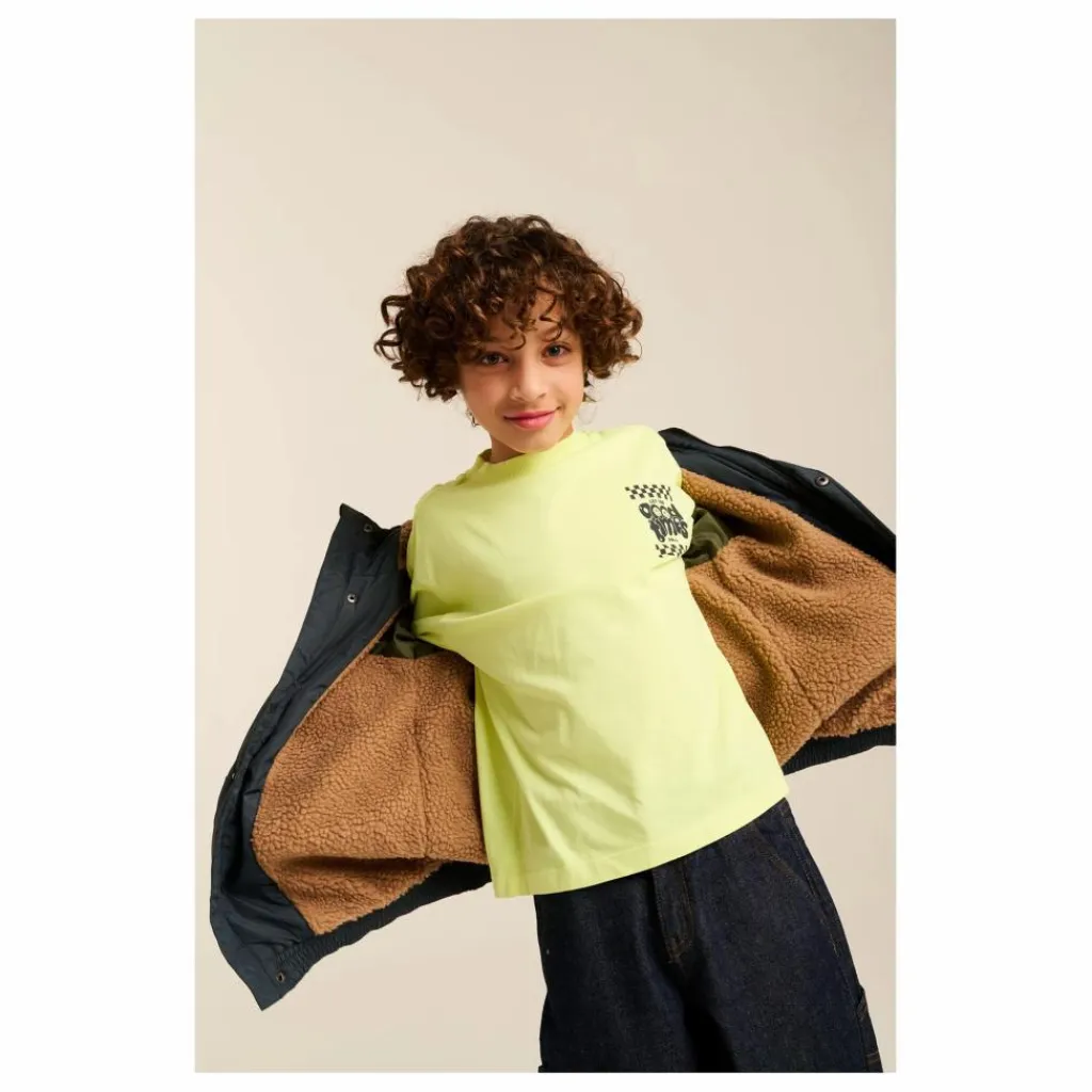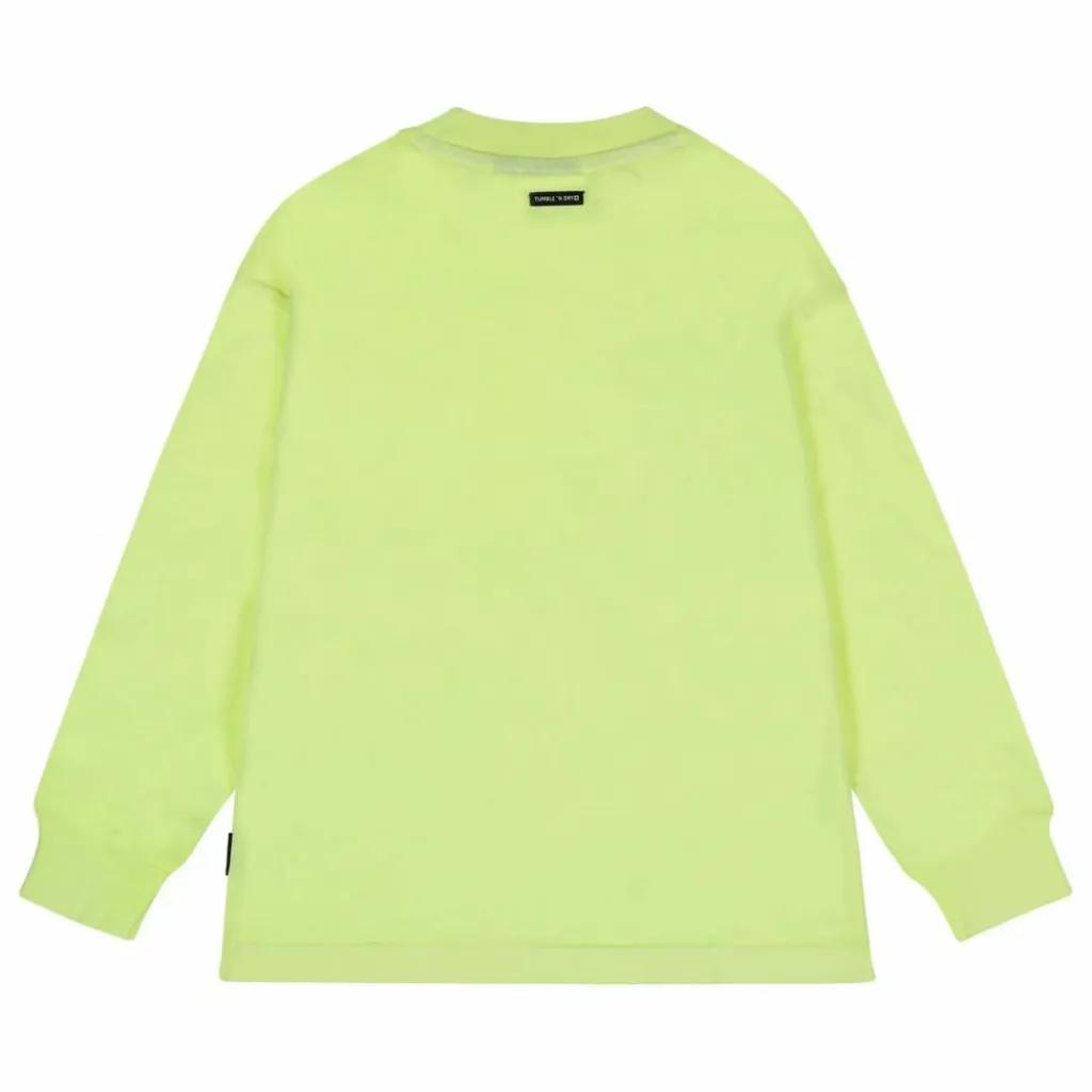 - T-shirt à manches longues en coton biologique avec teinture fluorescente, bords côtelés et impression sur la poitrine.