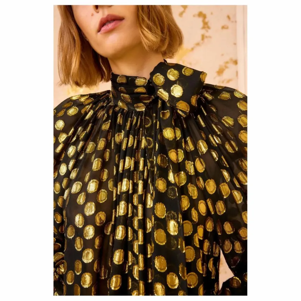 Scintillant sur le podium AW25 dans le look 14, la robe Loretta est confectionnée en fil coupé lurex, rehaussé de pois dorés tissés dans une délicate soie noire. Le nœud souple à l’encolure crée un mouvement fluide, tandis que l’ourlet volant et superposé ajoute une touche ludique.