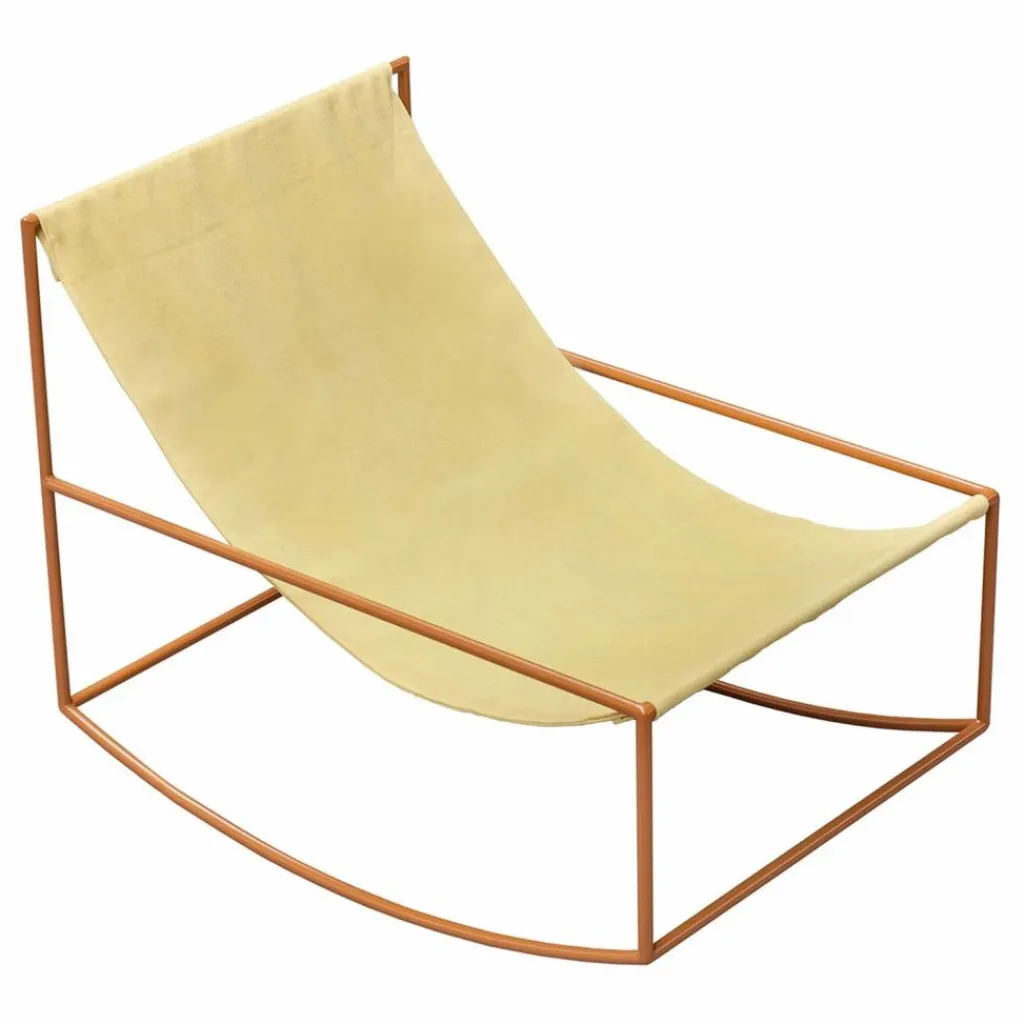 Imaginée par le duo de designers incontournables Muller Van Severen, le fauteuil Rocking Chair présente une esthétique minimaliste et colorée, appelant au farniente. Inspiré de la chaise longue, le concept de base simple d’étendre un tissu entre deux barres en acier est ici revisité pour offrir une vision légère, fluide et graphique.