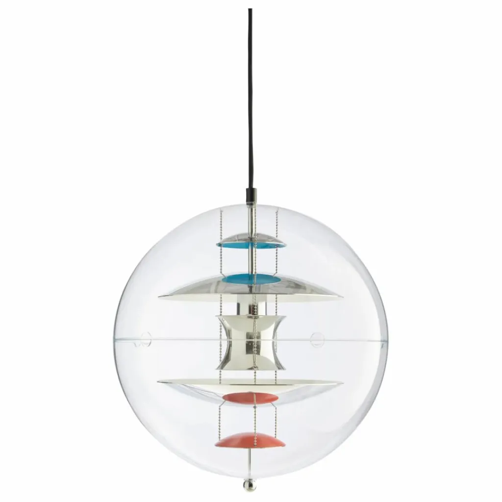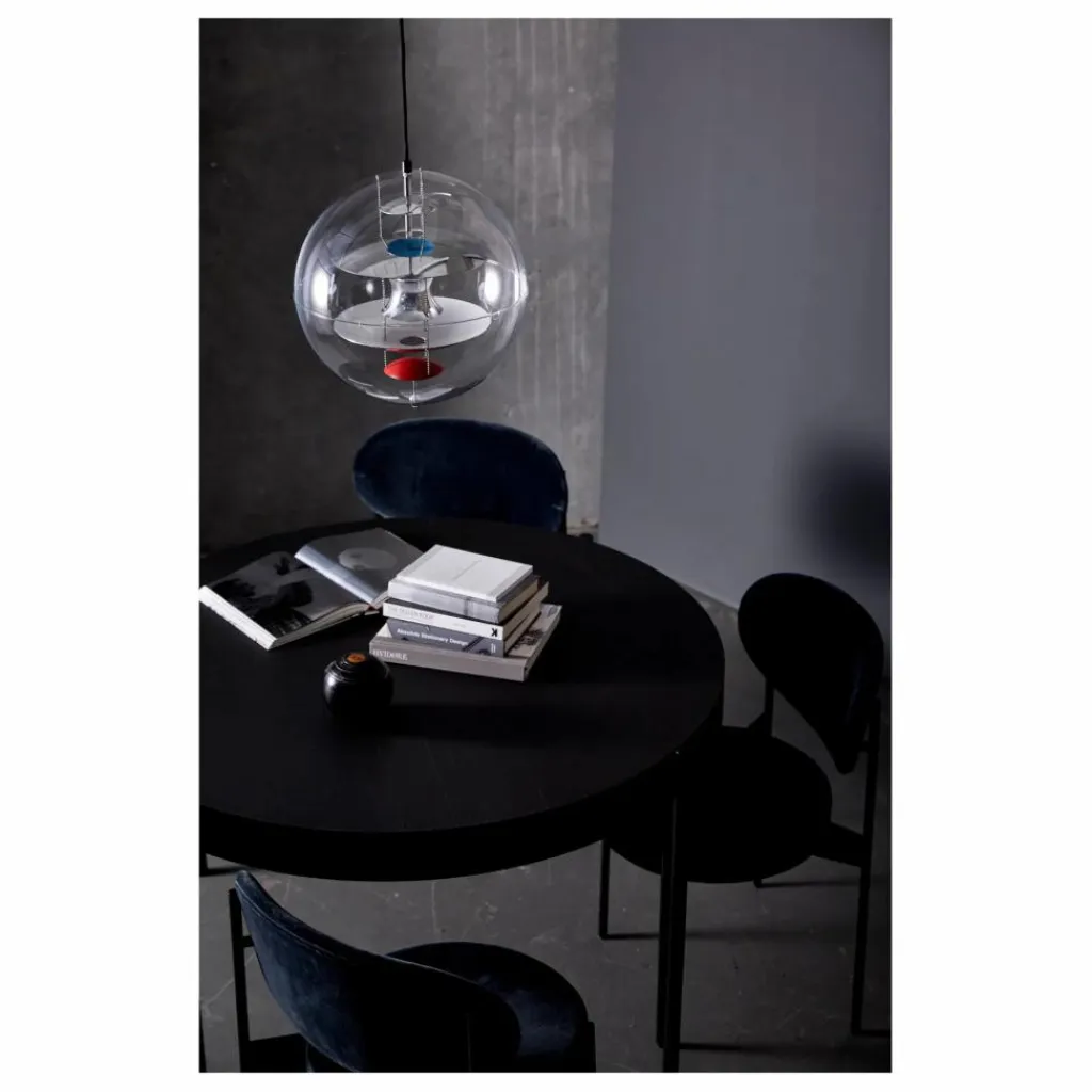 Plus qu’un luminaire, la suspension décorative VP Globe présente une sphère extérieure en acrylique transparent cristallin avec cinq réflecteurs internes suspendus par trois chaînes en acier. Des éclats de rouge et de bleu apportent la touche finale à ce design sculptural futuriste et soulignent l’ADN du design Panton. Avec la VP Globe, l’ambition du designer Verner Panton était de concevoir une lampe capable d’attirer le regard et d’unifier une pièce, qu’elle soit suspendue seule ou à plusieurs. Idéale au-dessus d’une table de salle à manger, dans un couloir ou un long corridor, elle sera aussi sublime comme élément sculptural dans un coin.