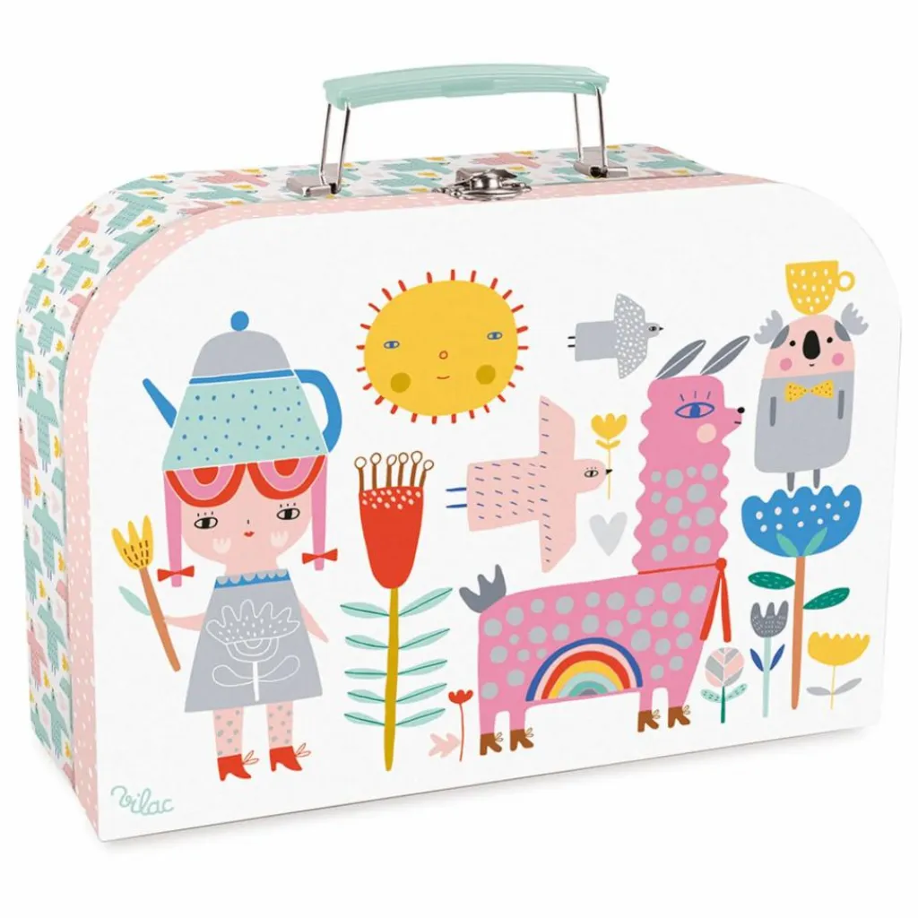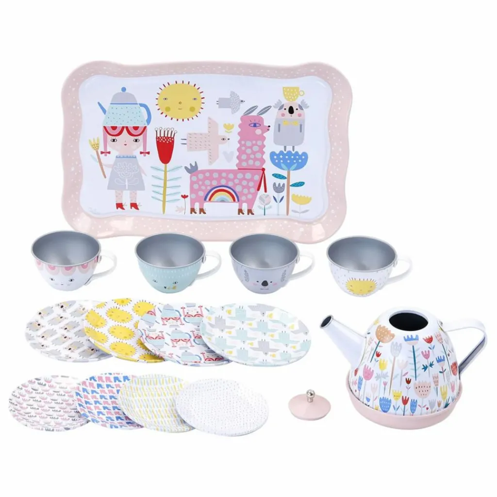 Notre service à thé musical est composé d’une théière, d’un plateau, de quatre assiettes, et de quatre tasses avec soucoupes. Et surprise, la théière est magique ! Lorsque votre enfant va servir le thé, en penchant la théière, une joyeuse mélodie (« Joyeux anniversaire ») va venir enchanter le goûter. Cette dînette musicale ne nécessite pas de piles, la musique est jouée par une boîte à musique mécanique qui se remonte avec une clé fixée sous la théière. Afin de ranger et transporter facilement la dînette, nous vous proposons une jolie valise décorée sur le thème Pop : lama, koala et soleil rieur vous souhaitent un « bon appétit » .Un univers très coloré
