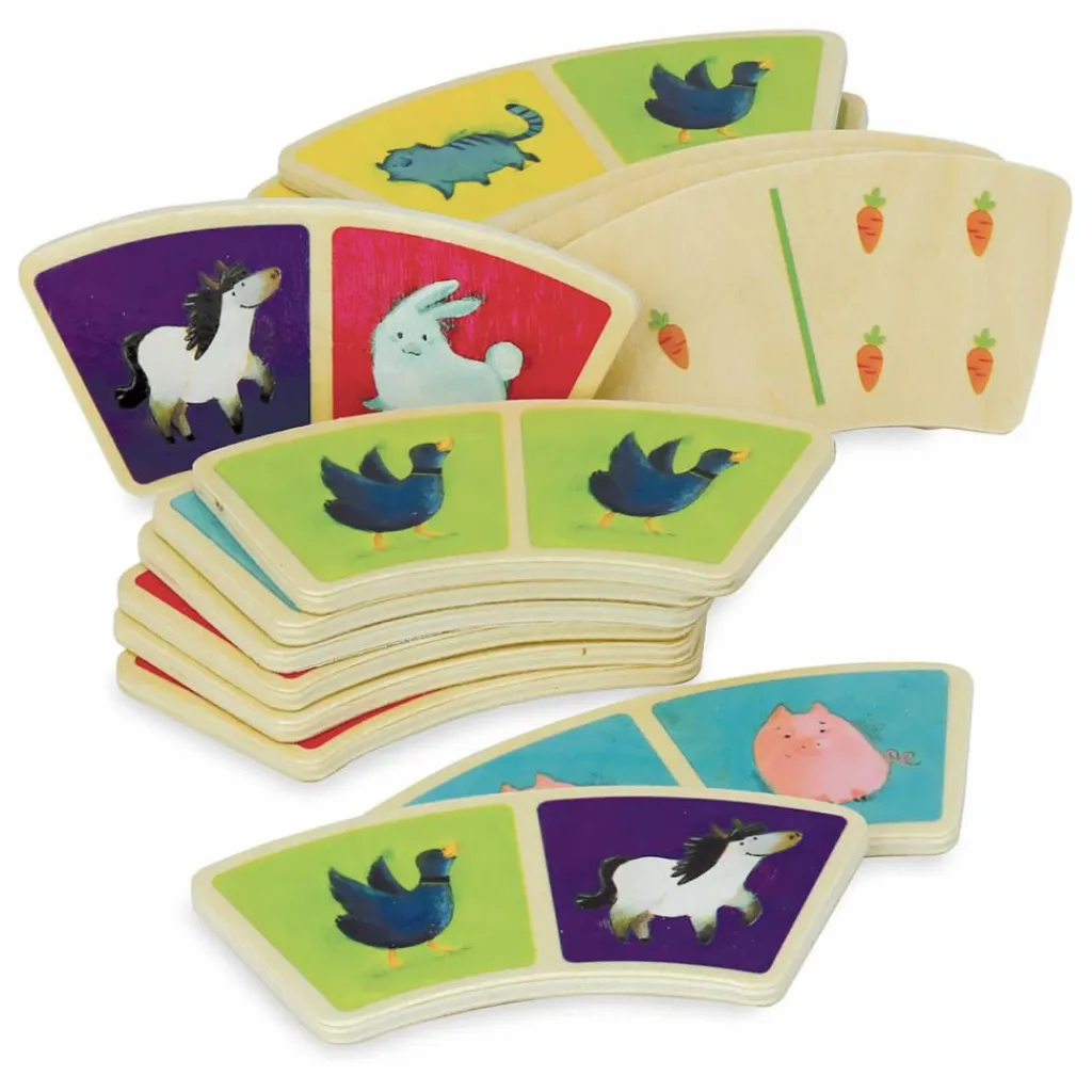 - Ce set de dominos en arc de cercle est illustré sur le thème de la ferme. Les dominos sont réversibles : d’un côté des illustrations à associer, de l’autre des points sous forme d’étoiles. Les pièces sont assez grosses pour que les petits puissent les assembler facilement et y jouer en toute sécurité.