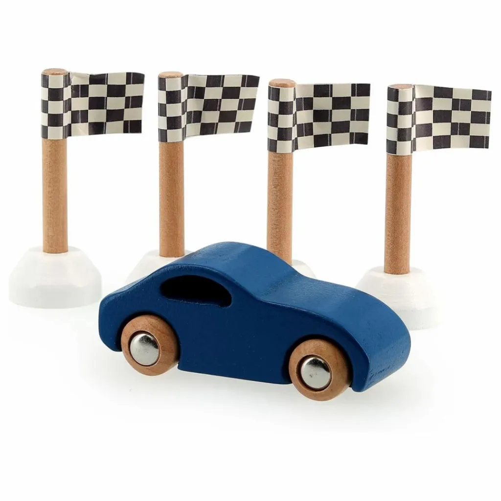 - • 1 grand garage en bois.• 1 voiture en bois.• 4 drapeaux signalétiques en bois.