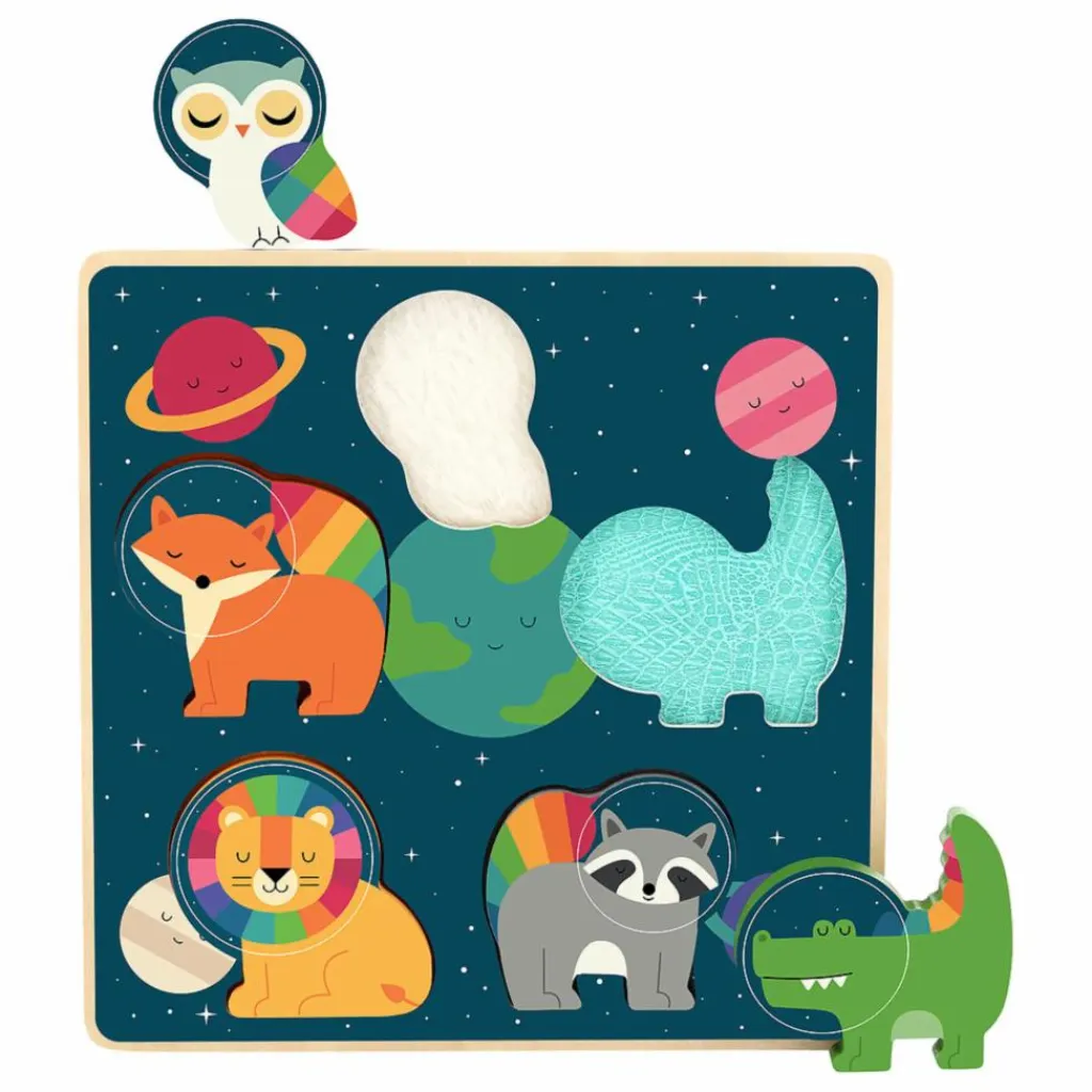 - Sous chaque animal, se cache une texture que votre enfant découvre en soulevant les pièces. Doux, granuleux, rugueux, avec des stries, les textures cachées sous les animaux procurent autant de sensations qui permettent à votre enfant de développer plus finement le sens du toucher.