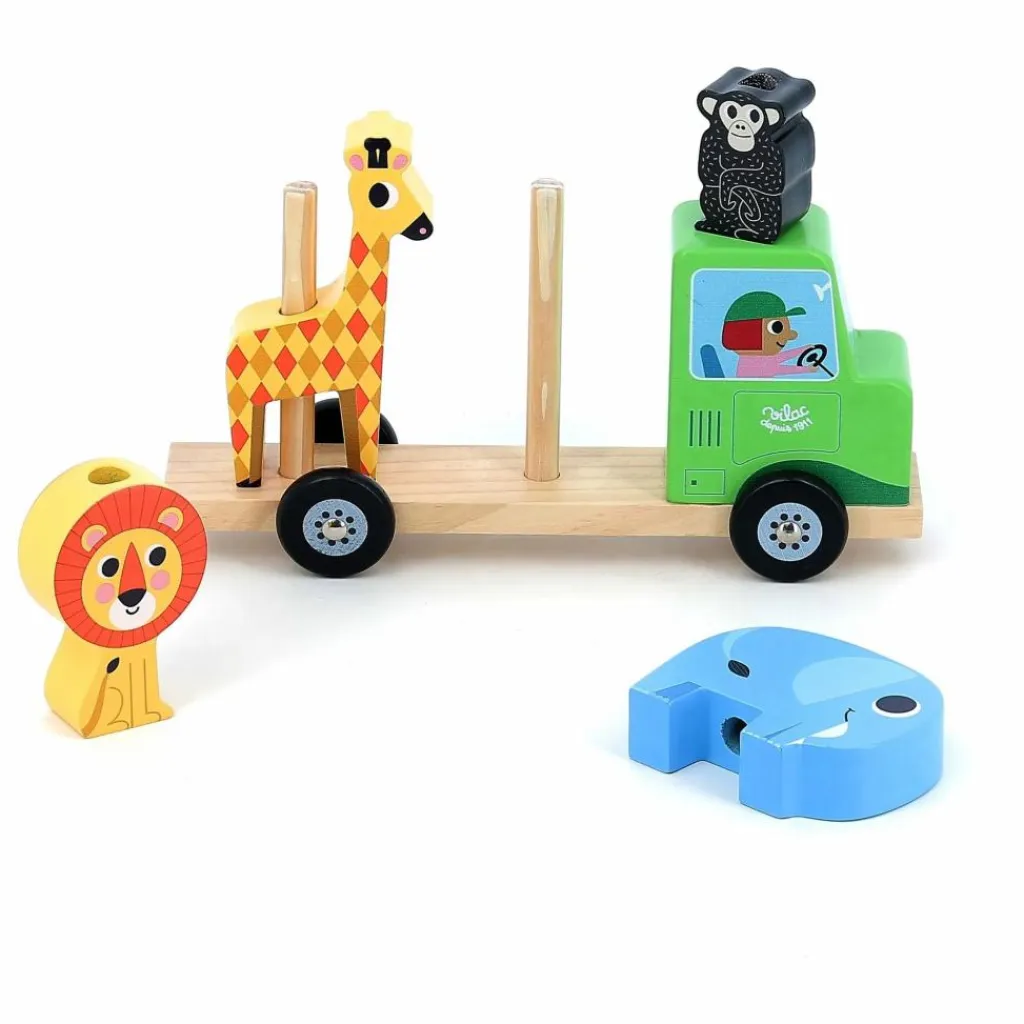 - • 1 camion et 1 remorque en bois.• 4 animaux en bois : éléphant, lion, singe et girafe.