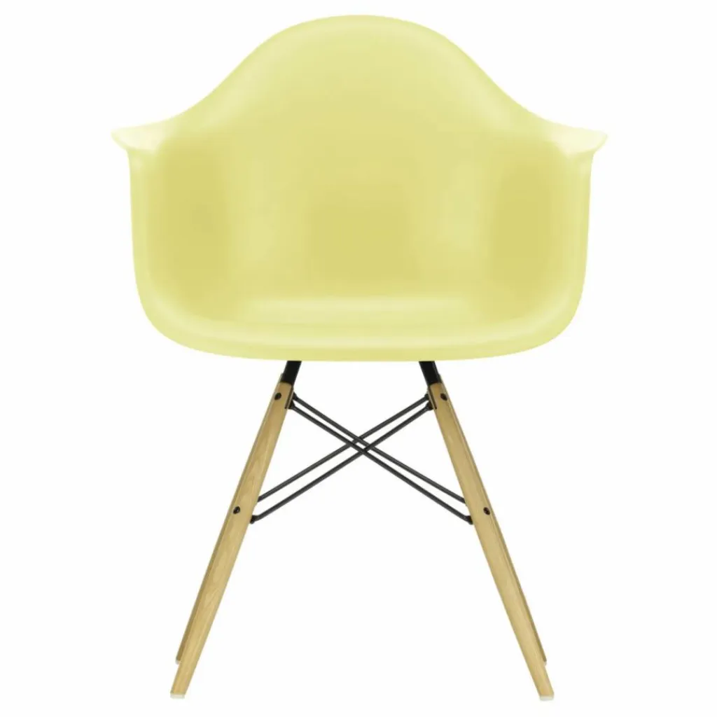 La chaise DAW (Dining Height Armchair Wood Base), conçue par Charles et Ray Eames, est un exemple emblématique d’un siège dont la coque peut être associée à différents types de piètements. Son piètement en bois crée un contraste intéressant avec la coque en plastique recyclé post-consommation. Cette combinaison de matériaux offre non seulement un aspect visuel attrayant, mais elle contribue également à la durabilité de la chaise en utilisant des matériaux recyclés.