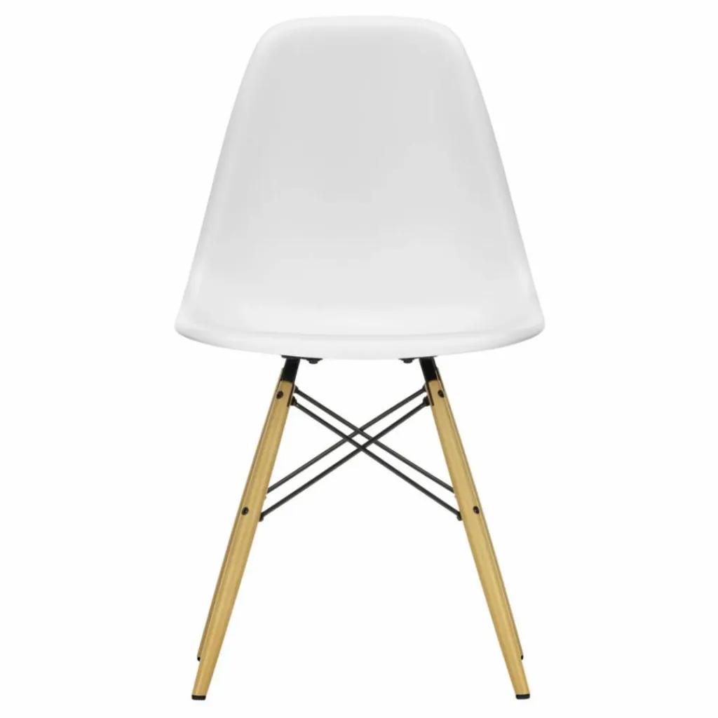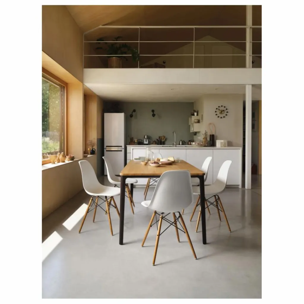 La chaise DAW (Dining Height Armchair Wood Base) a été conçue par Charles et Ray Eames, qui ont marié une coque d’assise aux formes organiques – désormais fabriquée par Vitra à partir de plastique recyclé post-consommation – à un piètement à quatre pieds en bois. Cette combinaison contrastée de plastique et de bois confère à cette création classique un aspect chaleureux et décontracté.