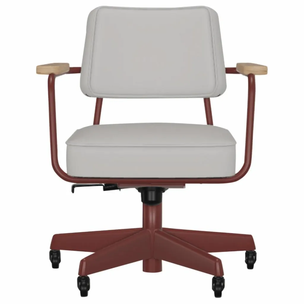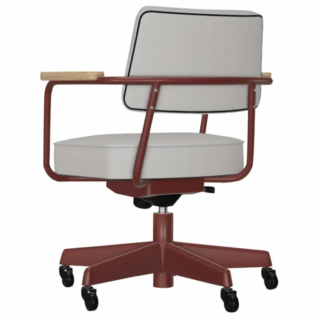 Crée en 1951 par le designer Jean Prouvé, le Fauteuil Direction Pivotant conserve une esthétique intemporelle, grâce à ses lignes modernes et ses exigences fonctionnelles. L‘assise et le coussin de dossier volumineux reposent sur un cadre élégant, tandis que les accoudoirs en bois confèrent au siège de bureau une note de confort familier.