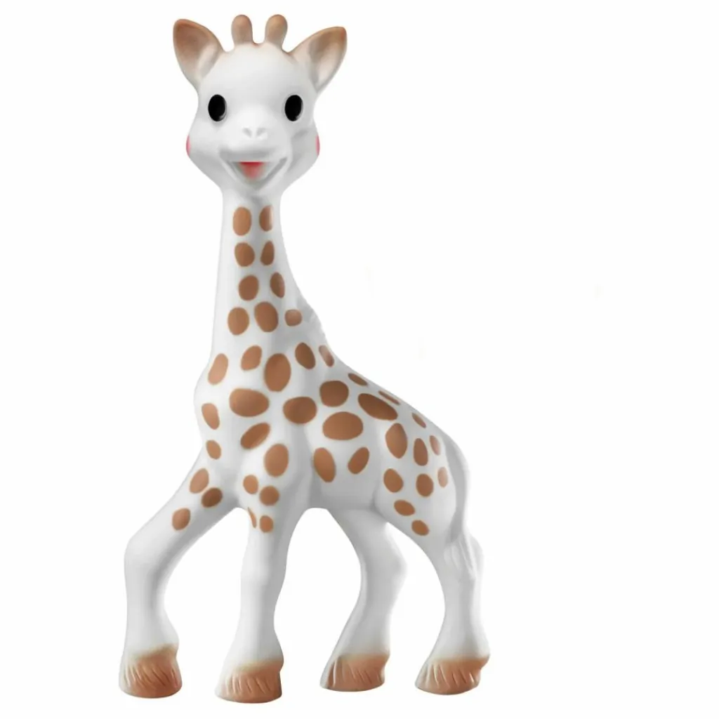 Sophie la girafe est une icône qui a traversé de nombreuses générations. Elle sera le compagnon préféré de votre enfant grâce à toutes ses qualités : indispensable, tendre, ludique et stimulante. Elle mettra tous les sens de bébé en éveil : la vue, elle attire l’œil de bébé avec sa robe colorée, l’ouïe, avec son sifflet elle l’amusera, le goût, à mettre dans la bouche elle soulagera aussi les gencives de bébé lors de poussées dentaires, le toucher, légère et maniable, et l’odorat, son doux parfum d’hévéa naturel la rendra reconnaissable au milieu de tous.