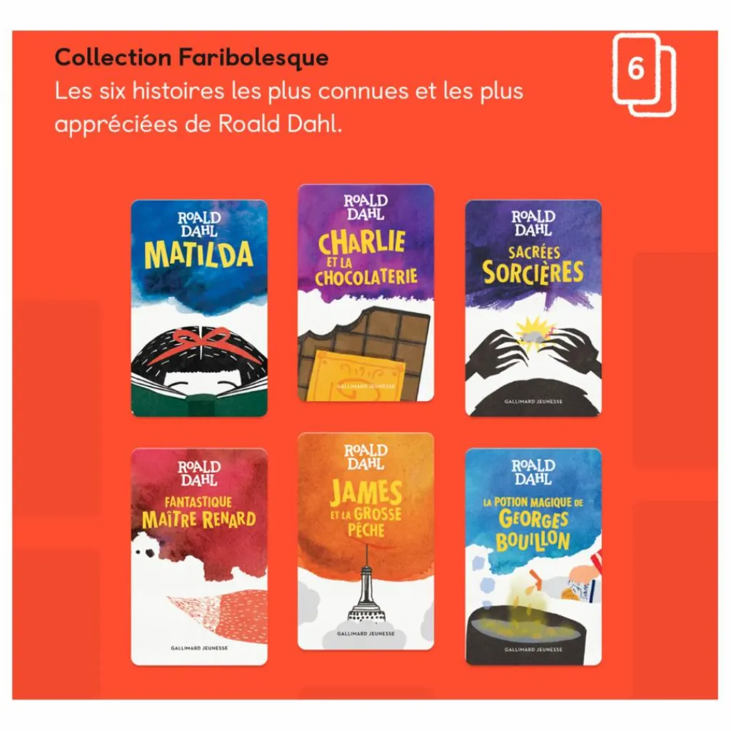 - 6 cartes : Matilda, Charlie et la Chocolaterie, Sacrées Sorcières, Fantastique Maître Renard, James et la Grosse Pêche, La Potion Magique de Georges Bouillon