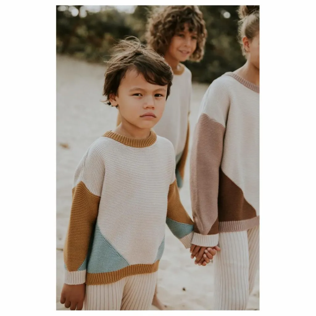 - Chaud, Emmanchures basses, Encolure ronde, Maille large, Manches longues, Bords-côtes, Etiquette de marque cousue , Tricolore
