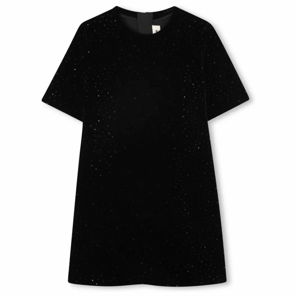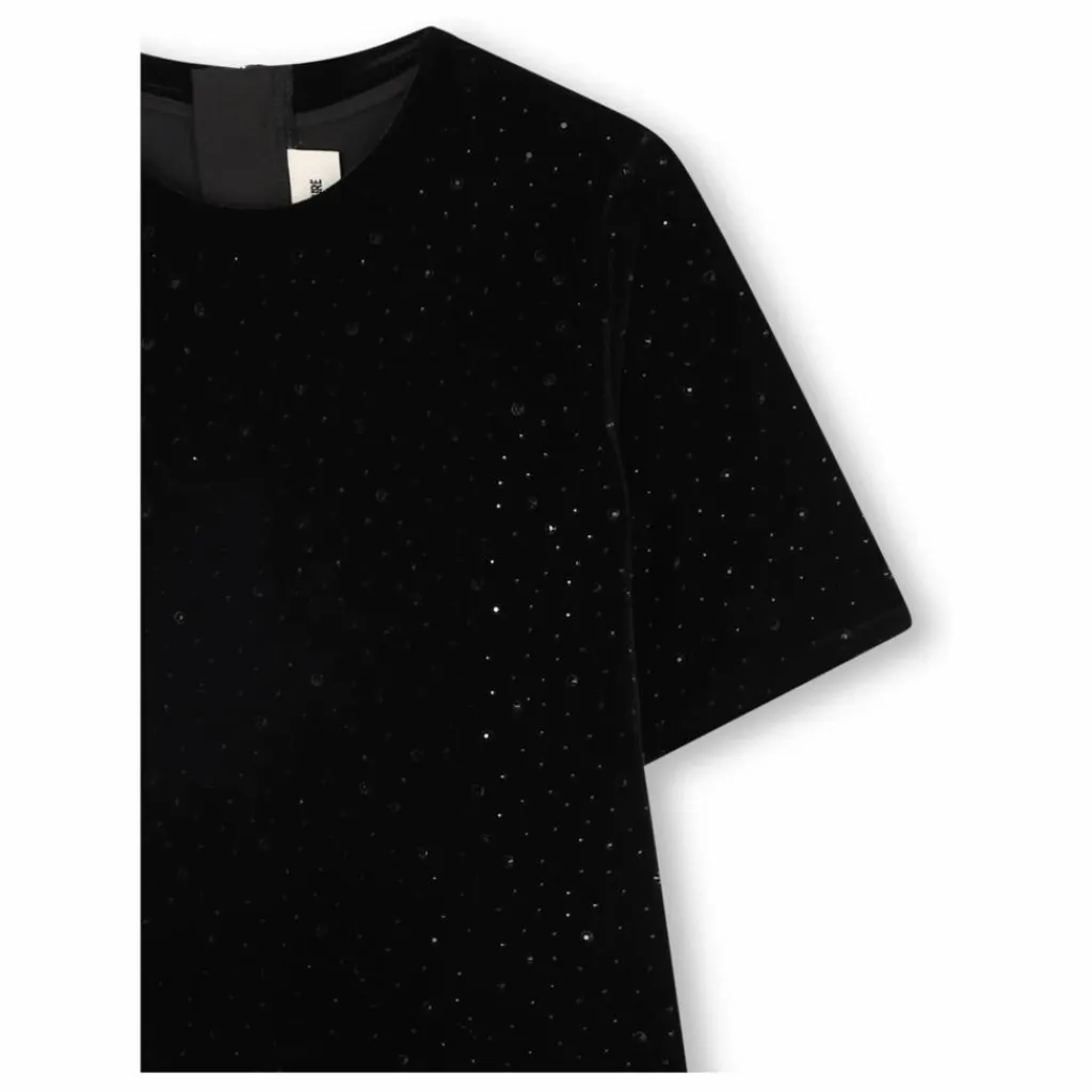 - Robe t-shirt courte en velours entièrement strassé, coupe droite, manche courte, fermeture zippée dans le dos.