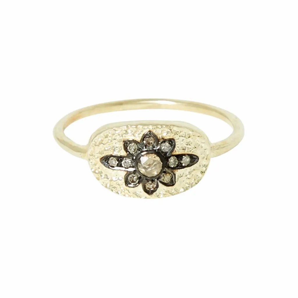 - Bague en argent massif doré à l’or 24 carats (3 microns), motif floral serti de diamants sur argent noirci.