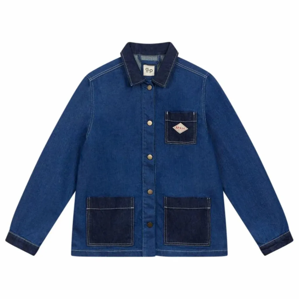 - L iconique veste Arsene revisitee ! – Veste femme denim . – Col chemise avec boutonnage devant. – Manches longues. – Col, poches et poignets en denim contraste brut. – 2 poches plaquees au bas devant et une a la poitrine. – Etiquette « AP & CO » sur la poche poitrine.