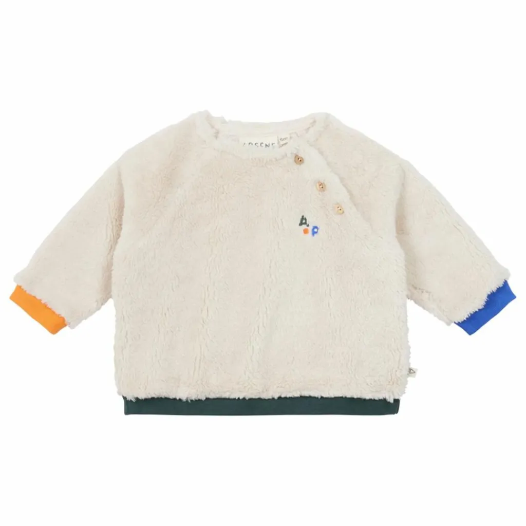 - Sweat bebe relax en sherpa . – Col rond. – Manches raglans avec ouverture boutonnee. – Finition bord cote aux poignets et bas du corps contrastes. – Broderie « AP » a la poitrine. – etiquette petit drapeau cousue a la couture cote. – H25BS36