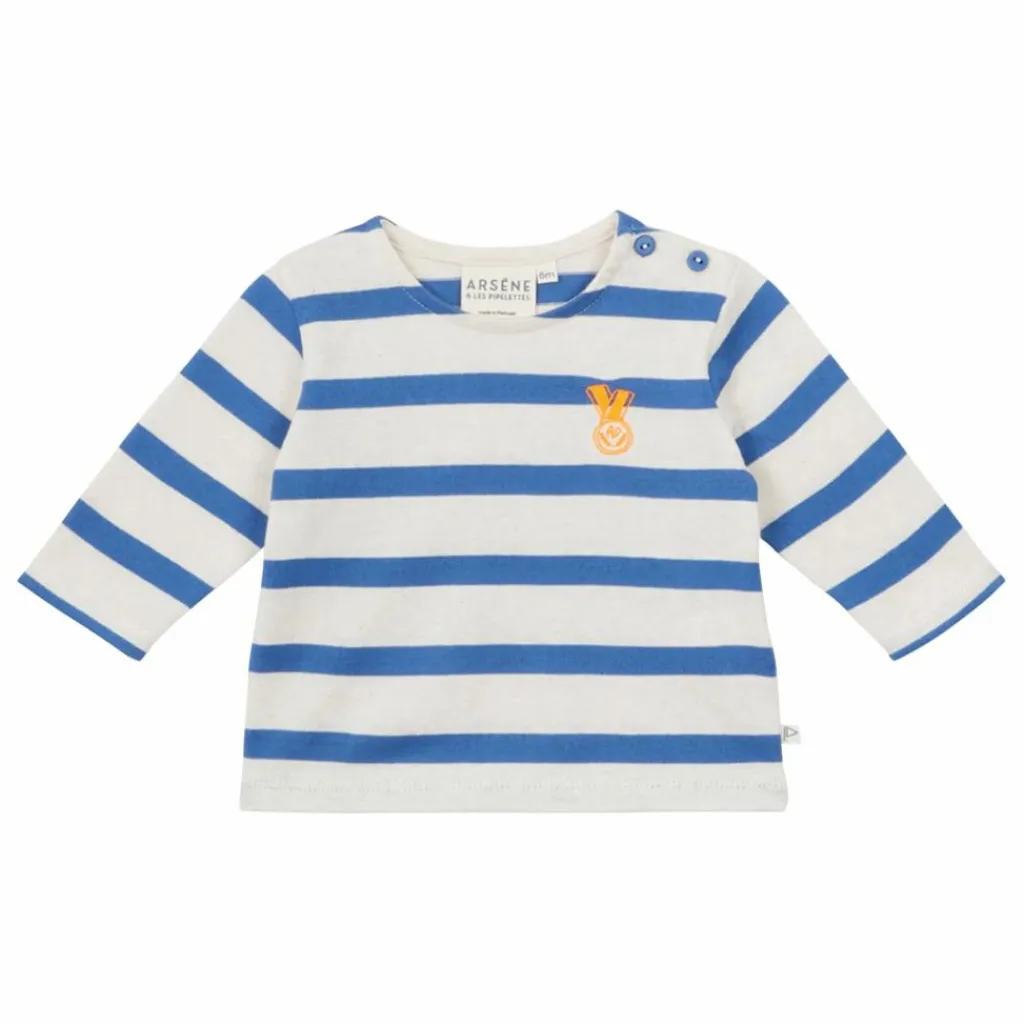 - Mariniere bebe . – Jersey en coton bio. – Manches longues. – Ouverture avec boutons a l epaule. – Broderie « medaille » orange fluo a la poitrine. – etiquette petit drapeau cousue a la couture cote. – H25BT01