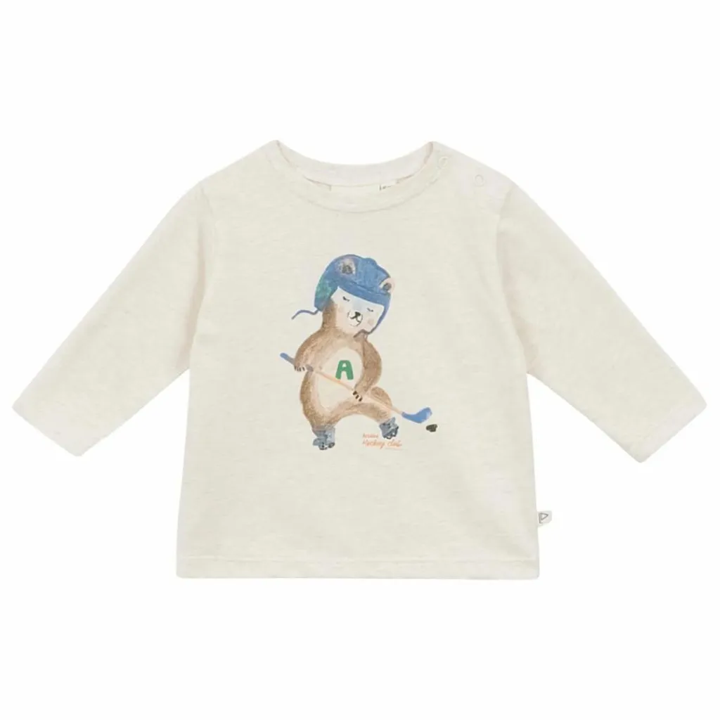- Tee-shirt bebe . – Jersey en coton bio. – Manches longues. – Finition bord cote au col. – Ouverture pressionnee a l epaule. – Impression aquarelle « Ours faisant du hockey » au milieu devant. – etiquette petit drapeau cousue a la couture cote. – H25BT02