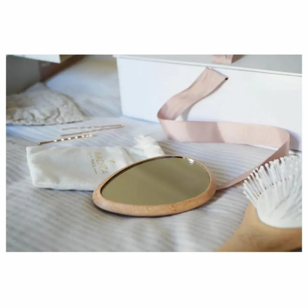 Ce miroir de poche en bois de hêtre vous suivra partout pour vos petites retouches au quotidien. Sa pochette en coton Bachca vous permettra de le ranger et de le protéger dans votre sac.