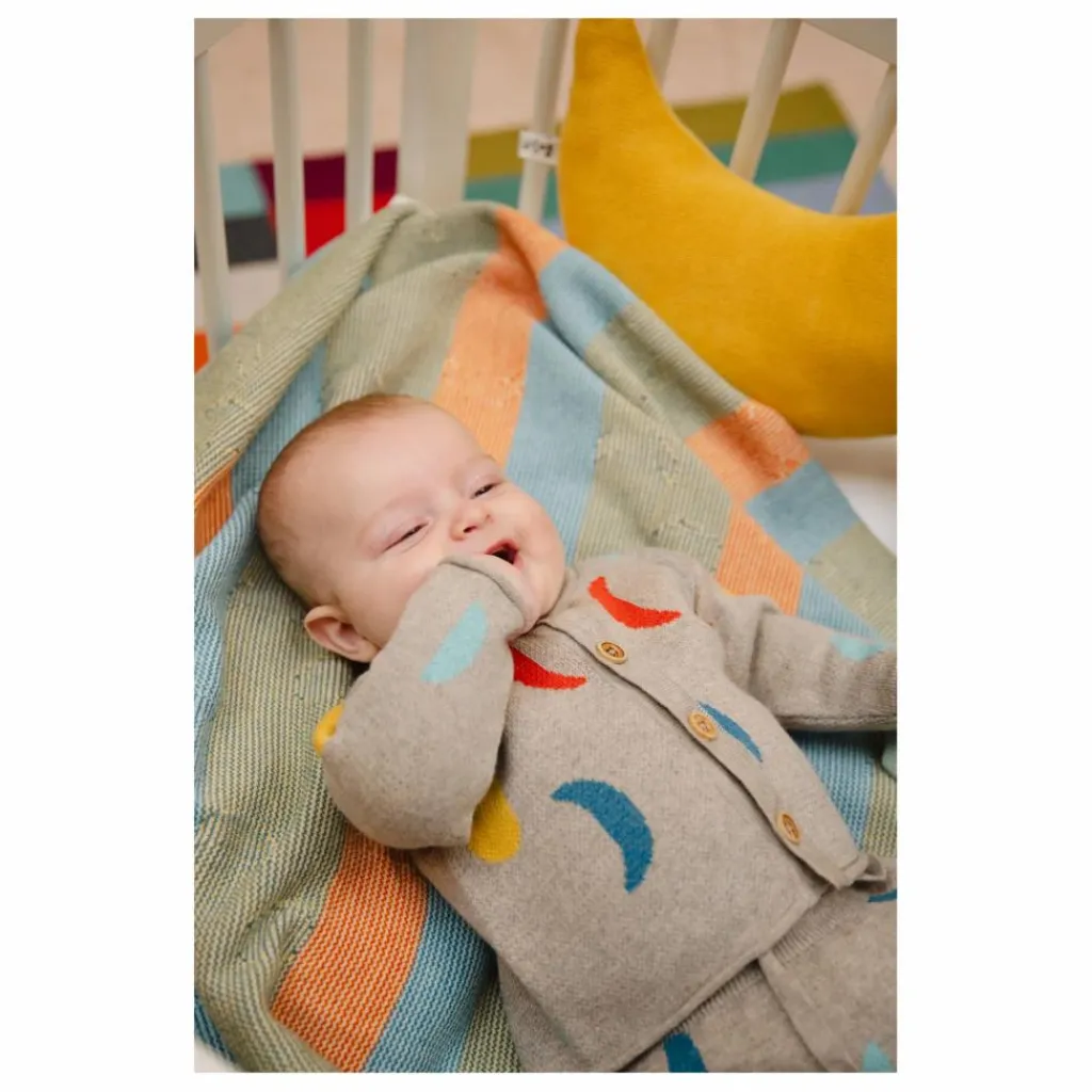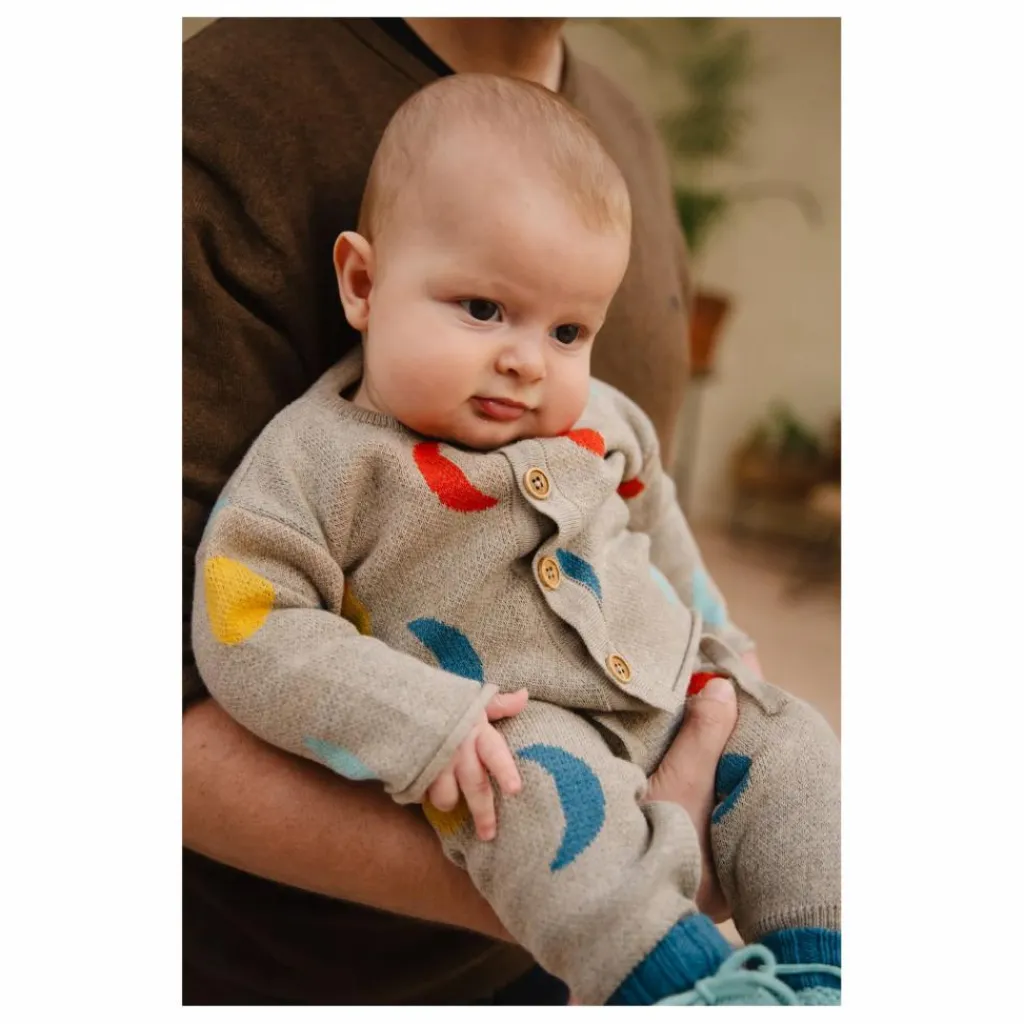 - Un cardigan très amusant ! Il a une forme carrée et des manches à petits bords roulés avec de jolis boutons en bois. Créez votre tenue en l’associant à notre pantalon tricoté ou à la culotte bouffante assortie.