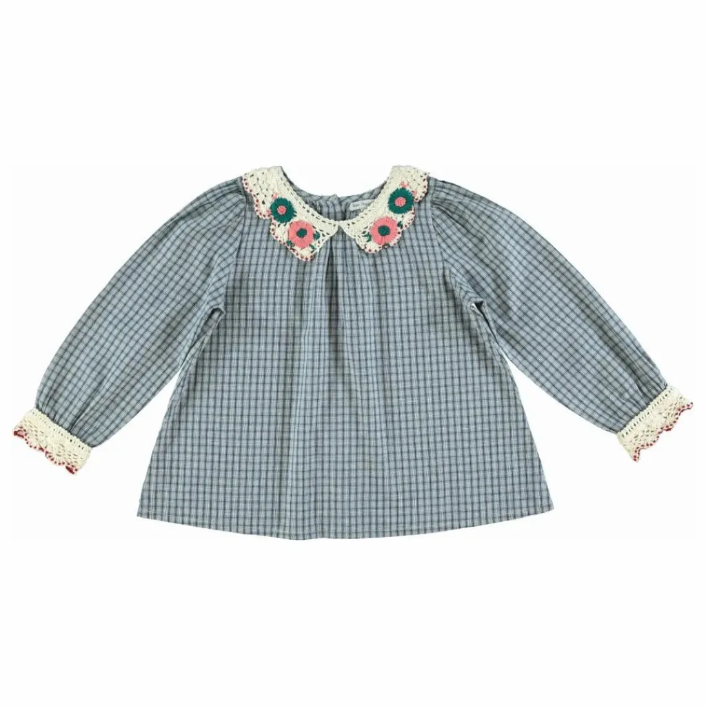 - L’adorable chemisier Rhea à carreaux bleus est confectionné dans le coton biologique le plus doux. Cette blouse présente de jolis détails au crochet sur le col et sur les élégantes manches bouffantes. L’habillement se fait au dos par des boutons de nacre.