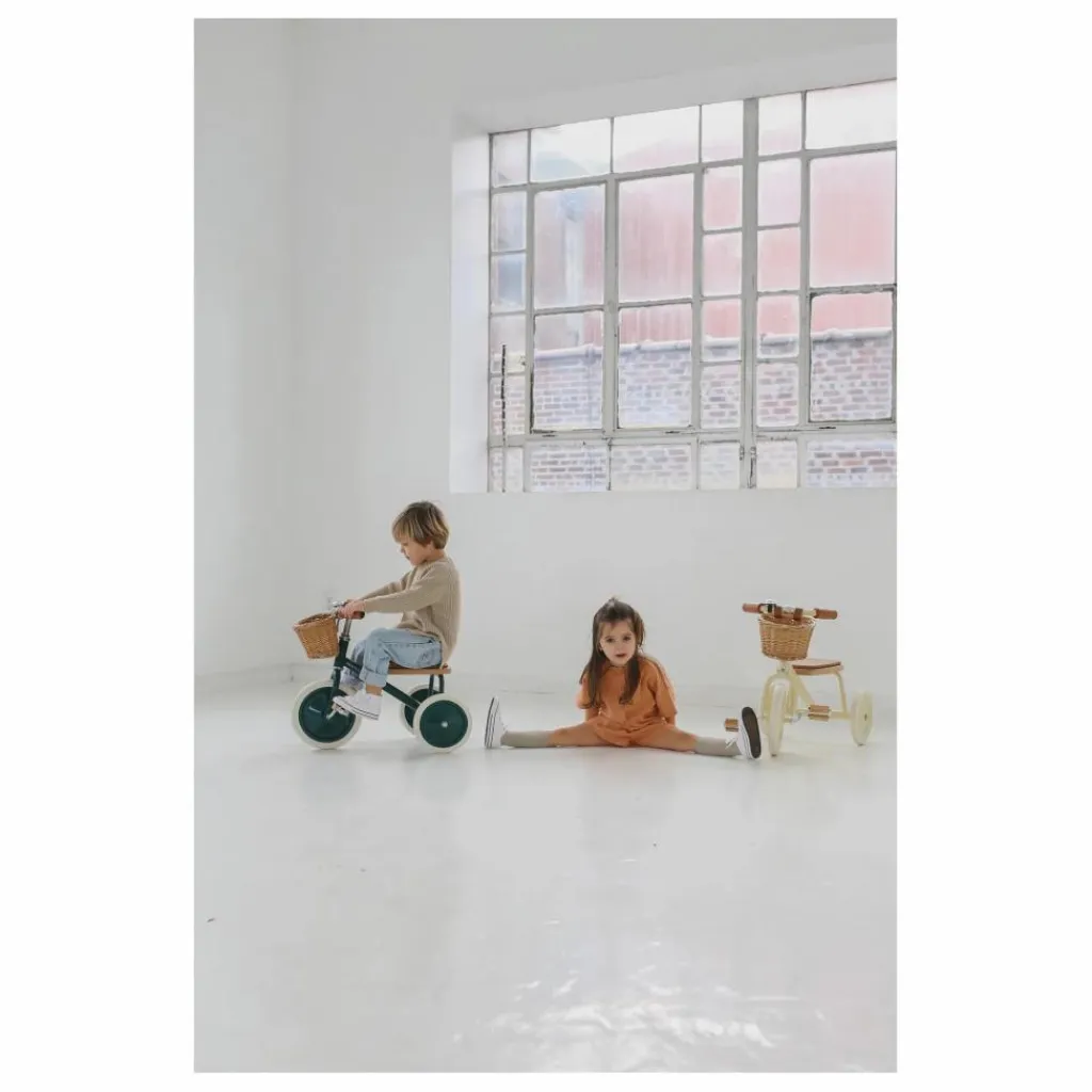 - Ce tricycle pour enfants est minimaliste et intemporel et convient parfaitement au plus jeune membre de la famille. Une aventure en plein air avec le plus petit sur un tricycle pour enfants vous attend ! Ce tricycle pour enfants convient à partir de 2 ans et est conçu pour durer des générations. Il est équipé d’un siège en chêne rembourré, de pédales en bois de chêne et de détails en cuir végétalien. Il est équipé d’un joli panier en osier à l’avant pour emporter l’essentiel au parc.
