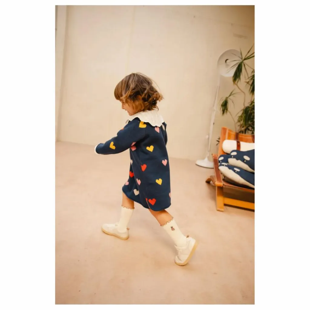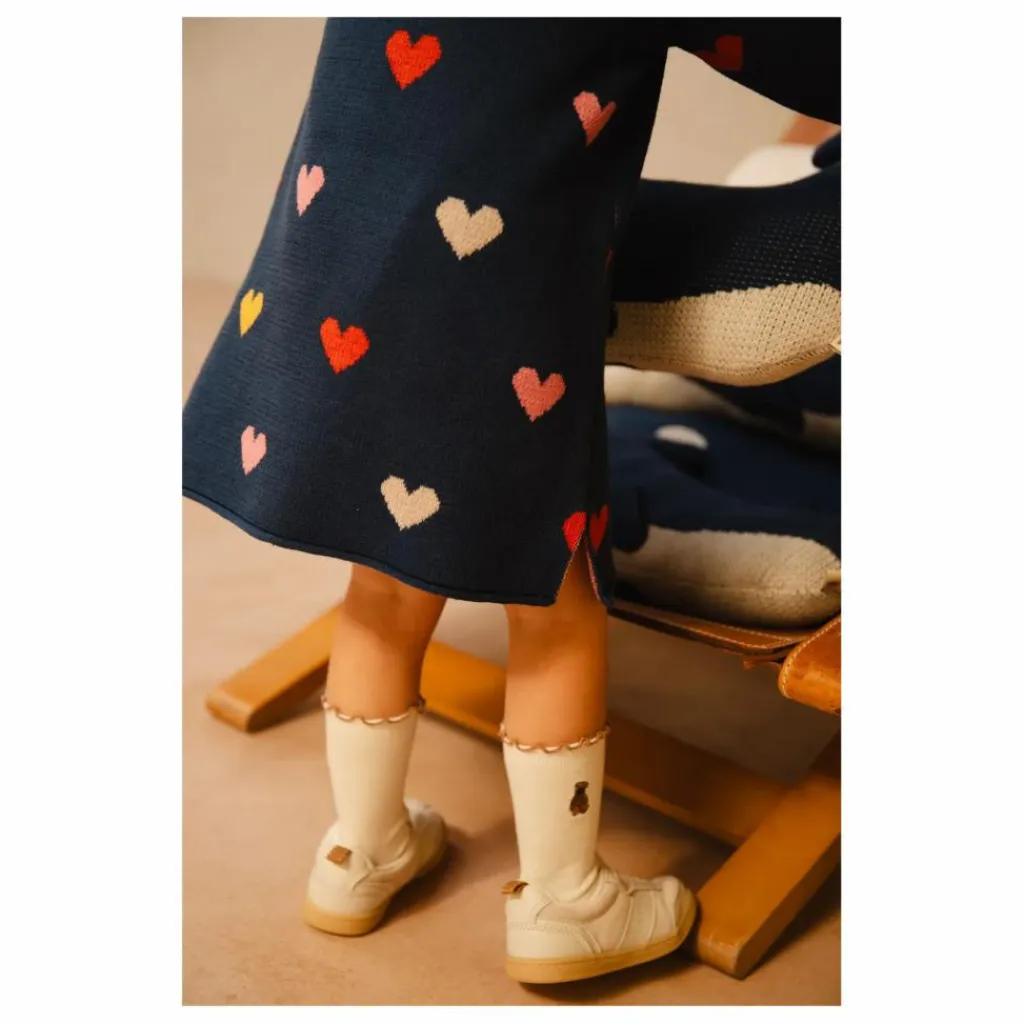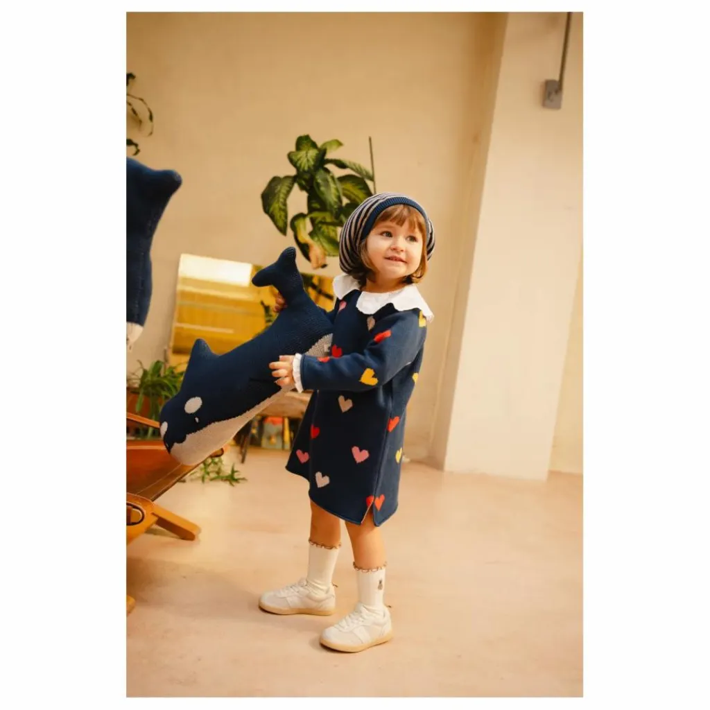- Un nouveau style ! Une amusante robe tricotée en forme de boîte avec des coeurs multicolores 🙂 qui se marie très bien avec notre béret rayé !