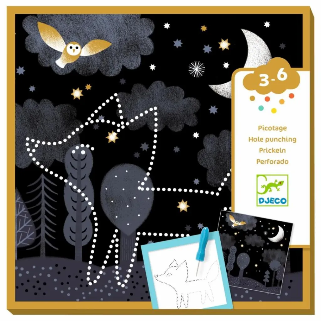 - L’enfant choisit un fond et l’animal qui va apparaître. Il bloque ensuite les 2 feuilles dans le support. À l’aide de l’outil, il picote en suivant les points des trames. L’enfant place une source lumineuse derrière son fond : surprise, l’animal apparait.