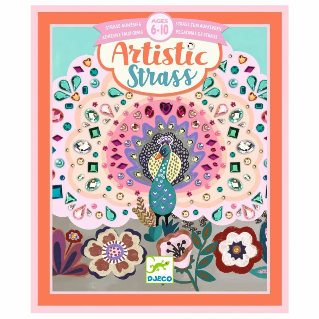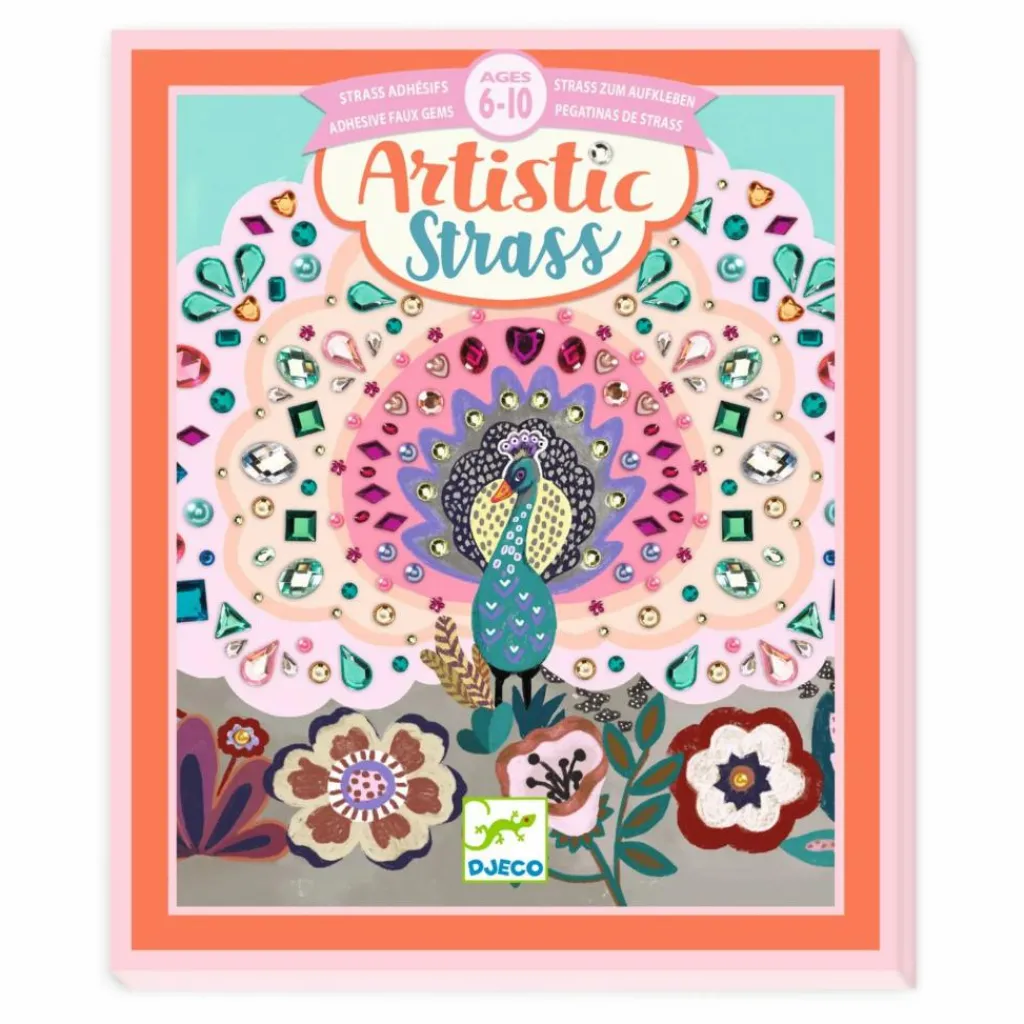 - 4 planches illustrées à compléter de 14 x 16 cm, 1 assortiment de plus de 600 strass adhésifs, 1 notice d’instructions en couleurs.