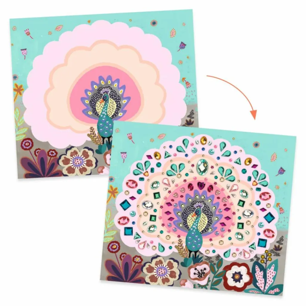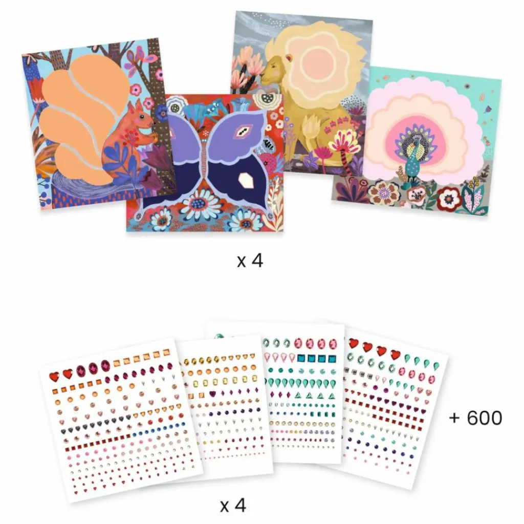 Ce kit propose d’embellir 4 cartes illustrées avec une multitude de mini diamants facettés aux formes et aux couleurs variées. Chaque planche de strass correspond à un tableau à décorer. En suivant le pas-à-pas proposé, l’enfant donne progressivement du relief et de la brillance aux tableaux et sublime les créatures illustrées.
