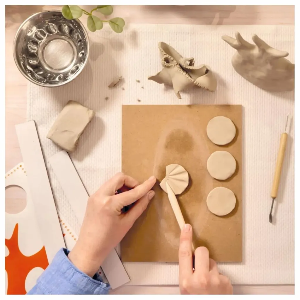 Le modelage consiste à sculpter l’argile avec ses mains et des outils de sculpteur professionnels, pour façonner volumes, textures et formes uniques. On travaille une véritable argile : elle sèche à l’air libre, sans cuisson, pour ensuite être peinte.