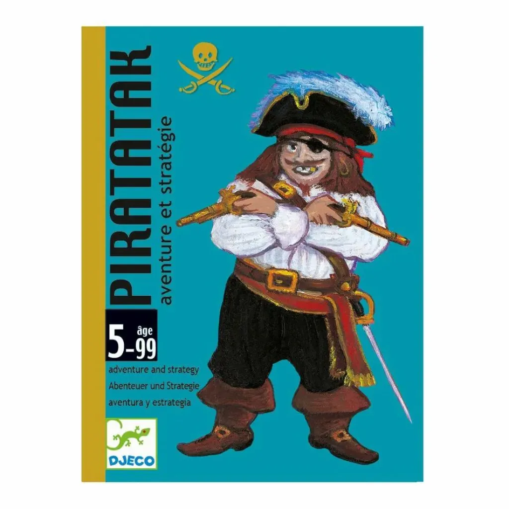55 cartes (24 cartes bateau pour construire 4 bateaux de 4 couleurs différentes, 20 cartes pièce d’or, 8 cartes pirate, 3 cartes canon), règle, dans une boîte / tiroir.Jeu de collecte sur le thème des pirates. Le but du jeu est d’être le premier à collecter 6 cartes qui vont permettre de reconstituer un bateau complet. Chaque joueur à son tour pioche ou achète des cartes. On pioche autant de cartes que l’on souhaite, à condition de ne pas piocher de carte pirate. Si c’est le cas on doit se défausser de 3 cartes, à moins de posséder une carte canon qui pourra être posée pour se défendre du pirate. Les cartes pièces d’or permettent d’acheter des cartes bateau de la couleur convoitée à un autre joueur. Un jeu amusant, plein de rebondissements, qui fonctionne très bien!