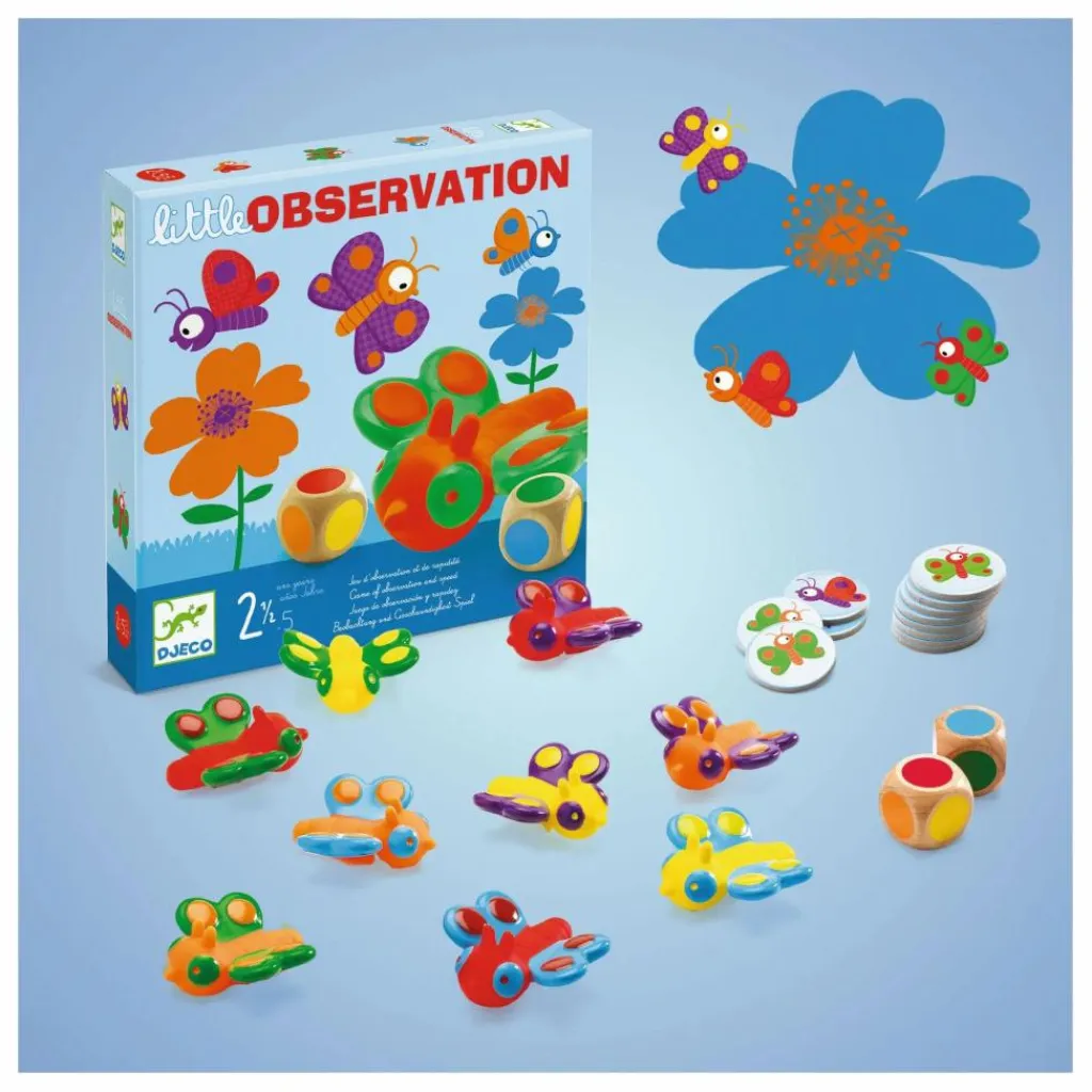 - 9 papillons bicolores en plastique souple, 2 dés en bois de couleur, 30 jetons. Règle du jeu en 10 langues.