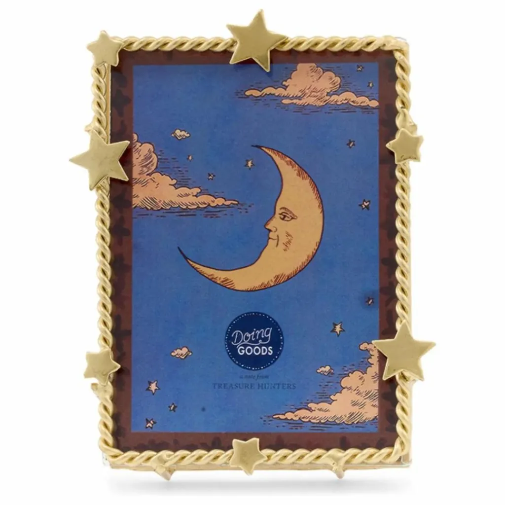 Découvrez le Cadre Étoilé Petit Luna, une belle addition à votre décoration intérieure. Ce cadre unique, fait à 100 % à la main par notre équipe talentueuse en Inde, est fabriqué en laiton recyclé avec une finition dorée brillante. Conçu pour contenir une photo de 10 x 7 cm, ce cadre ajoute un élément ludique et distinctif à vos souvenirs précieux.