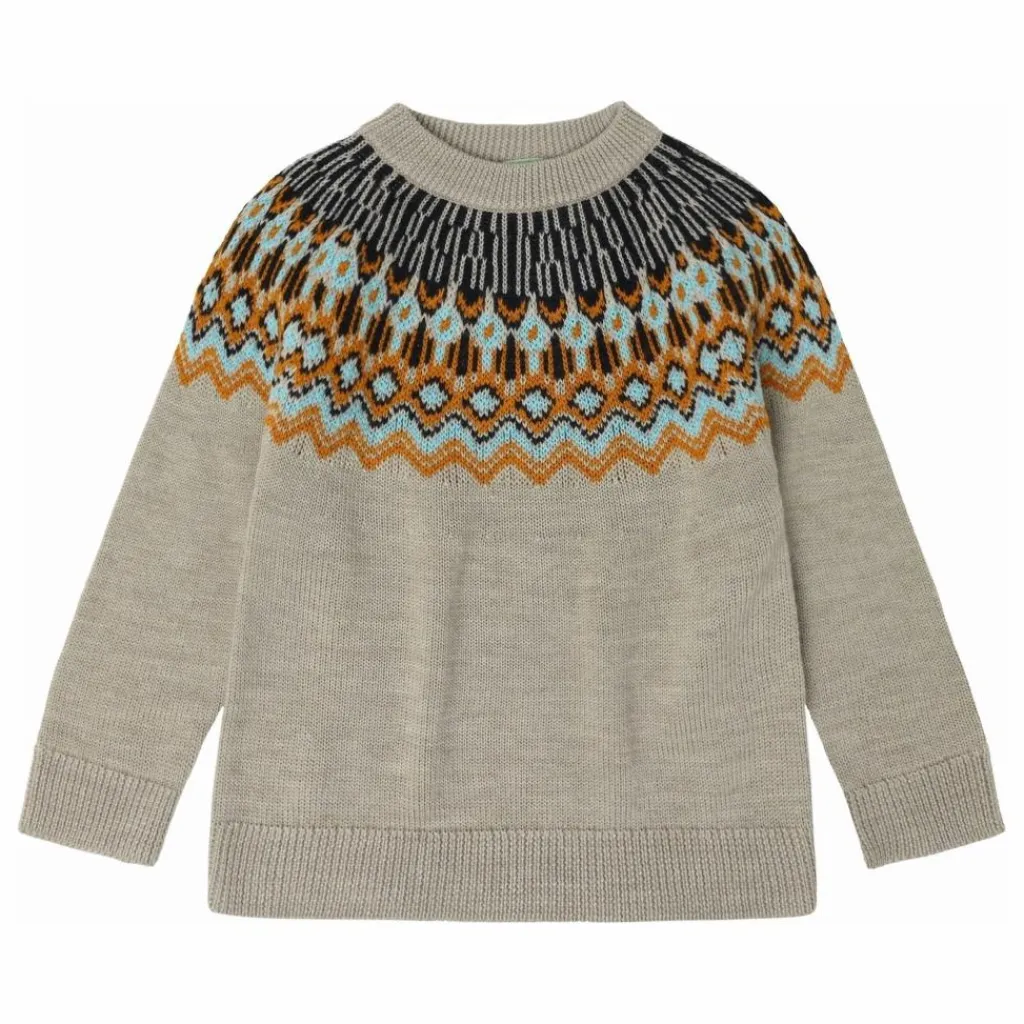 - Confectionné en laine mérinos douce, ce pull à manches longues présente une coupe légèrement ample. Il présente une encolure ronde, des manches raglan et un panneau graphique en haut, inspiré des motifs traditionnels de tricot Fair Isle. Le pull est tricoté en un seul jersey. La laine mérinos est certifiée BLUESIGN® et RWS, exempte de produits chimiques nocifs, et provient de moutons non mulets.