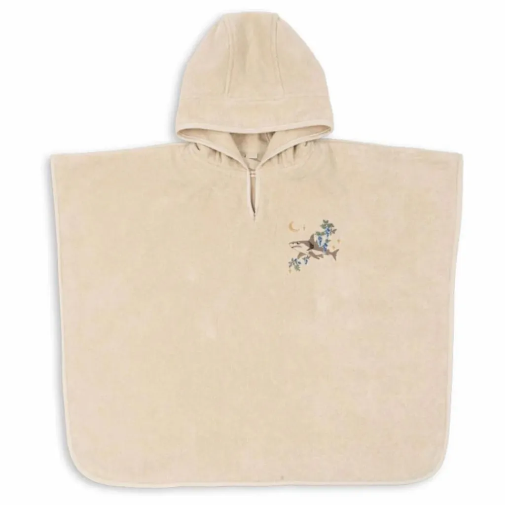 - Interdit à la vente aux États-Unis. Poncho doux à capuche. Broderie décorative dans le dos. Matière : 100% coton biologique. GOTS, biologique, certifié par CU1094701. Ce produit est certifié OEKO-TEX® STANDARD 100, classe 1 par DTI Tekstil, DTI 2276-361.