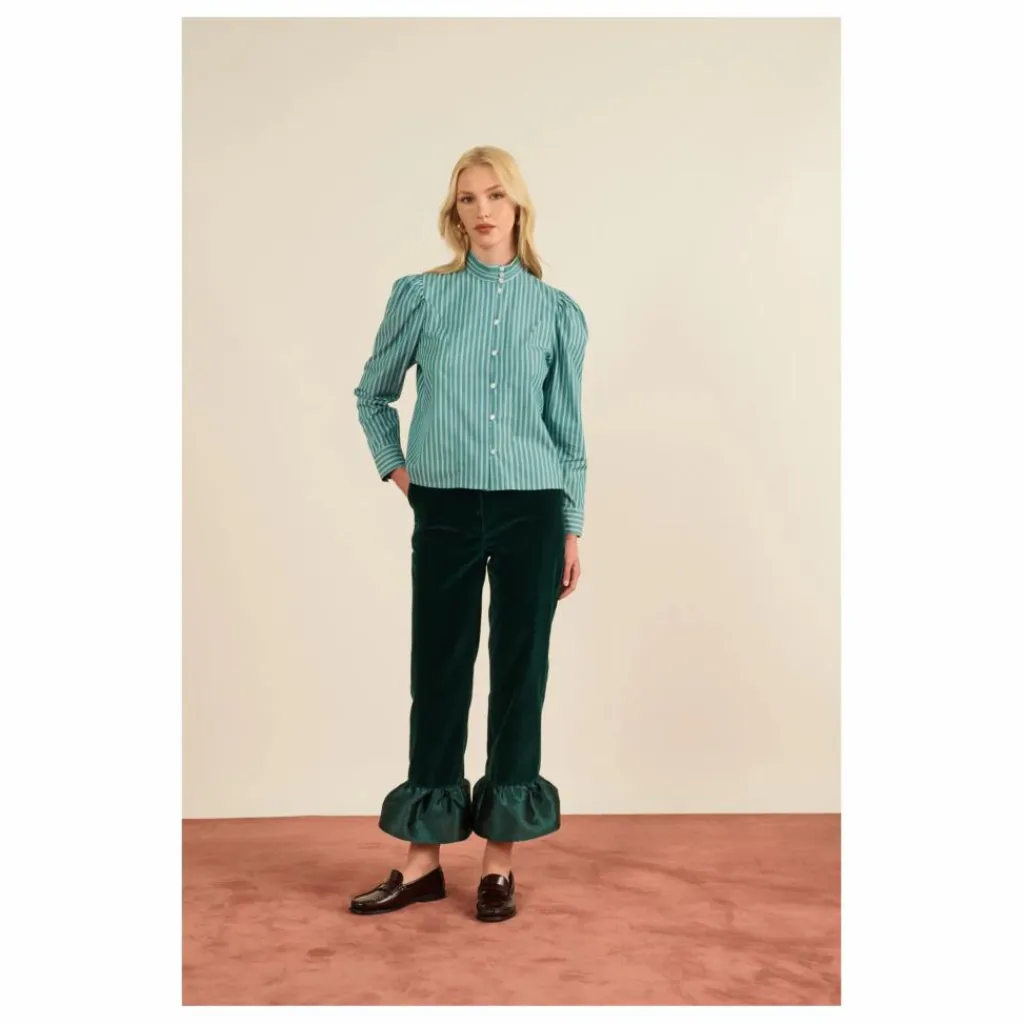 - La chemise Iza a une coupe régulière inspirée de la mode mandarine – Elle présente un col Mao et des boutonnières orientales – Elle est dotée de manches bouffantes – Elle est confectionnée en coton rayé vert et blanc.