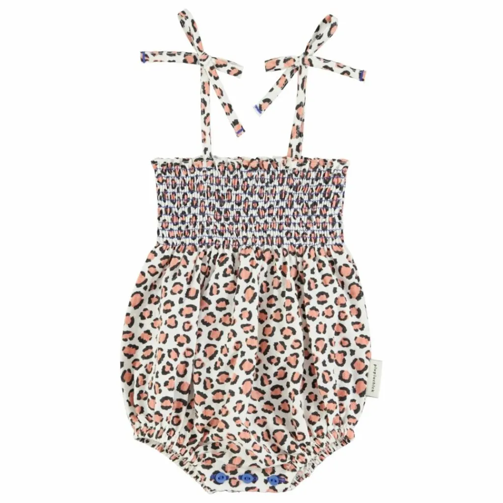 - Grenouillère pour bébé avec un motif fumé sur la poitrine. Poignets élastiqués. Boutons bleus à l’entrejambe.