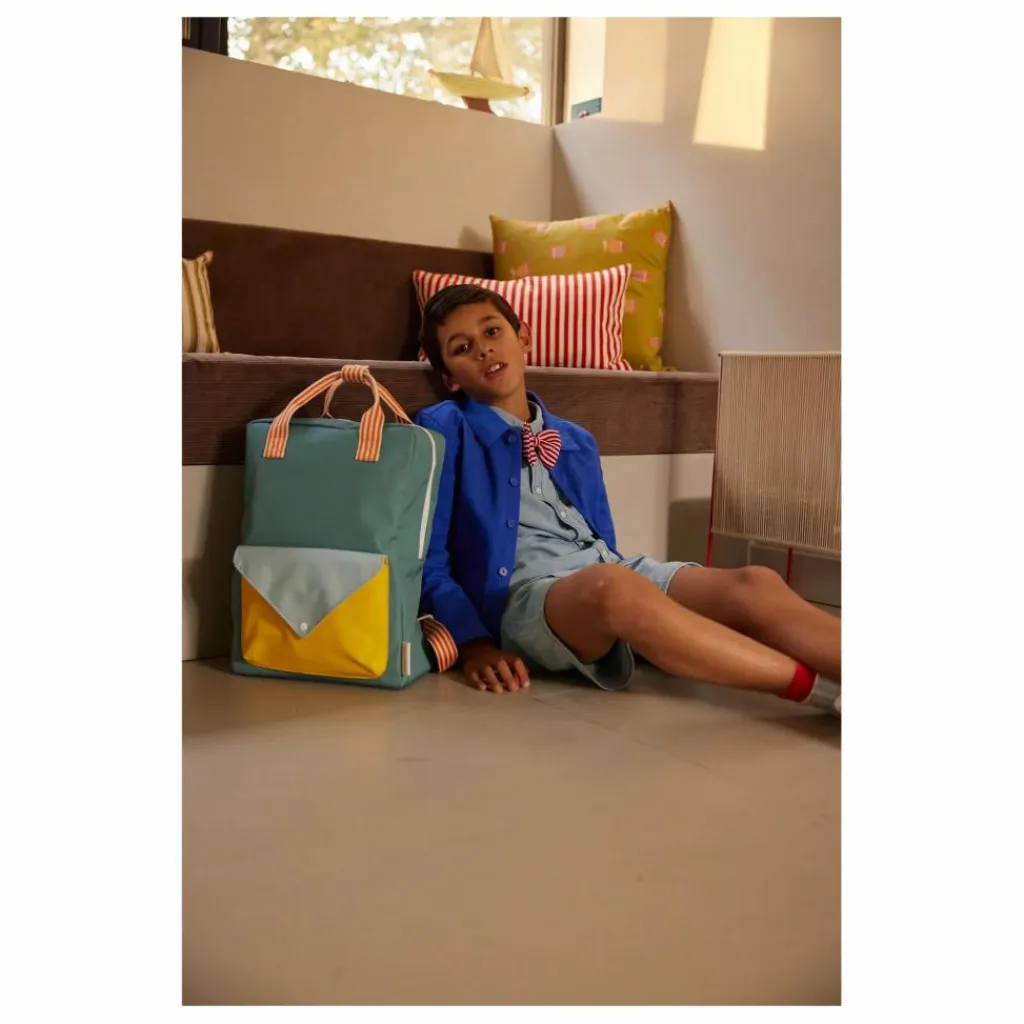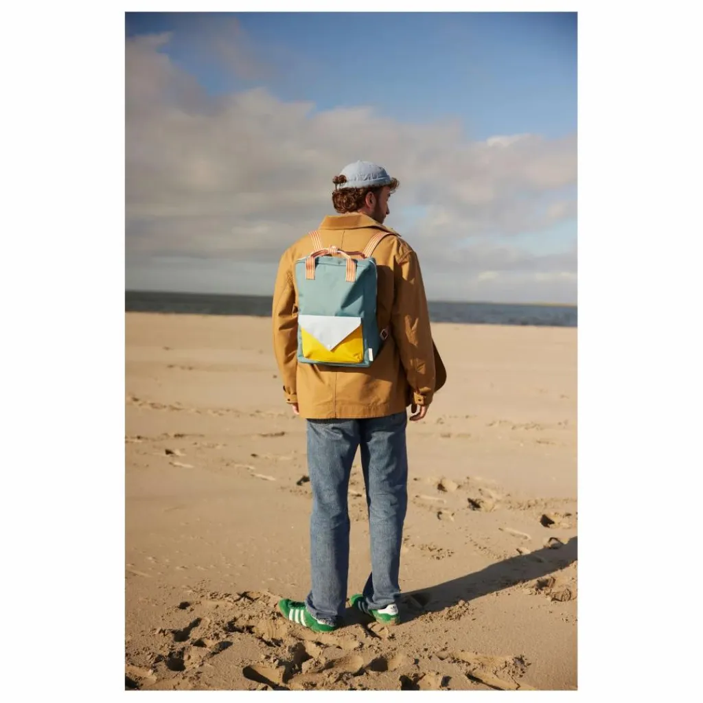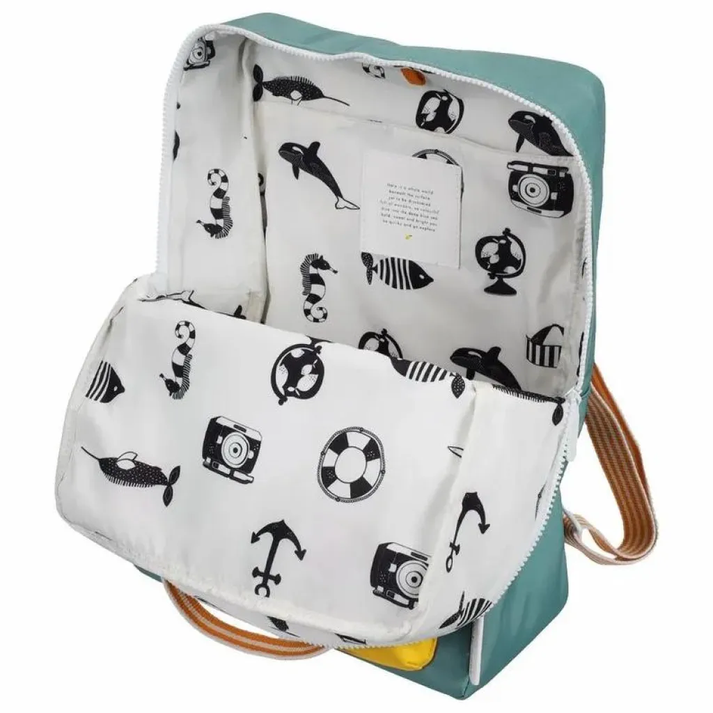 - Ce sac se distingue par son mélange de couleurs ! Il est doté d’une poche supplémentaire sur le devant, d’une doublure imperméable avec un motif dessiné à la main et de bretelles réglables. À l’intérieur, vous trouverez une bande élastique qui sert de porte-bouteille et une poche sur tout le dos qui se ferme à l’aide d’un velcro. Il y a aussi un badge pour mettre vos informations.
