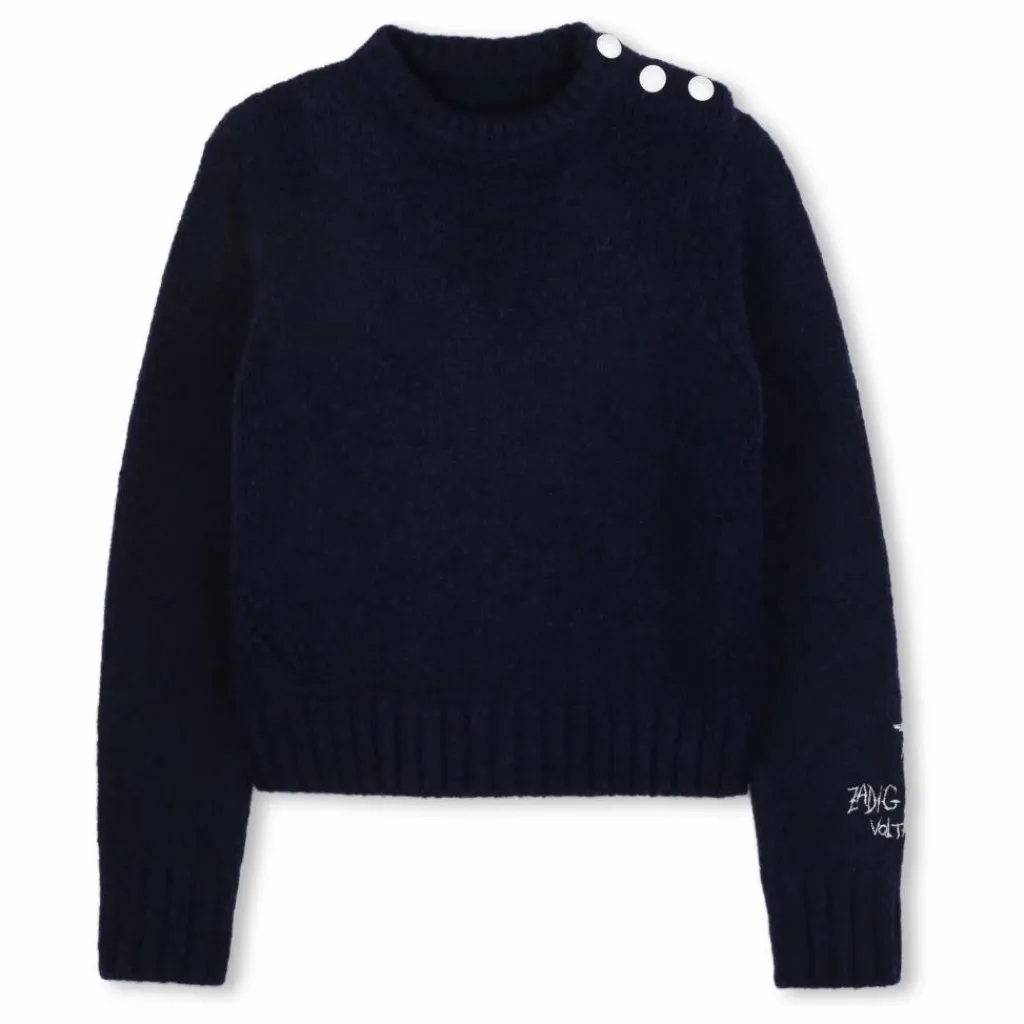 - Pull tricot, col rond et ouverture boutonnée sur l’épaule, logo fantaisie brodé sur la manche.