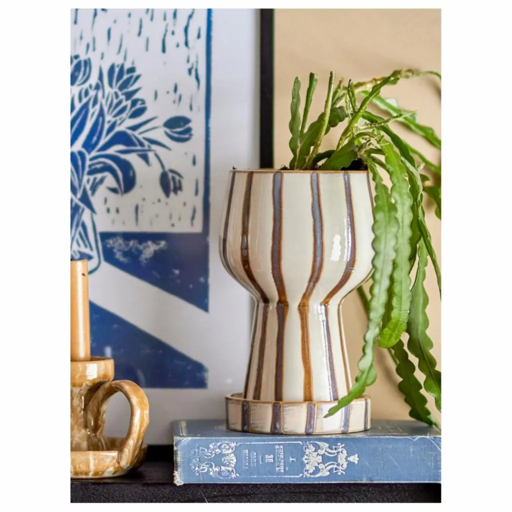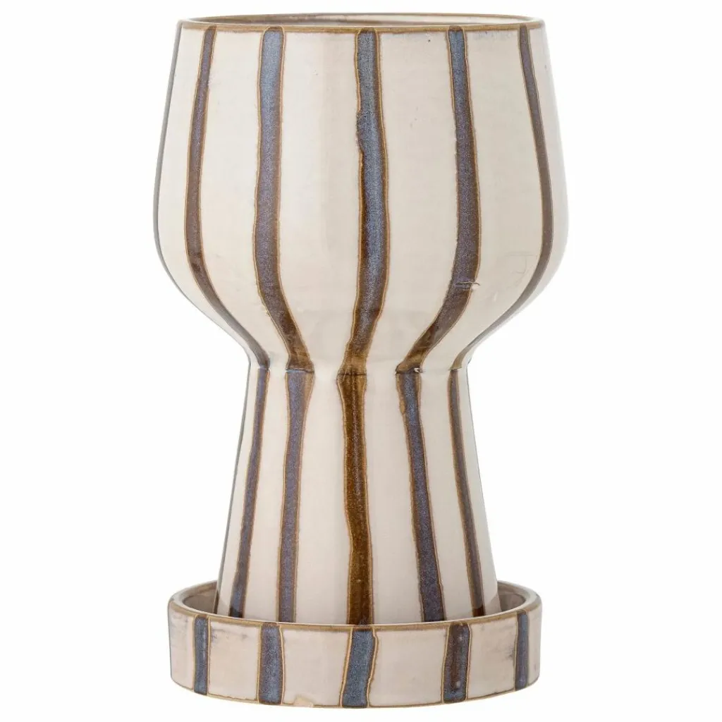 Le Pot de fleurs Agna est un pot de fleurs haut avec une soucoupe, fabriqué en grès dans une nuance claire. Il est orné d’un motif rayé peint à la main dans une nuance brune chaude, ajoutant une touche unique et personnelle.