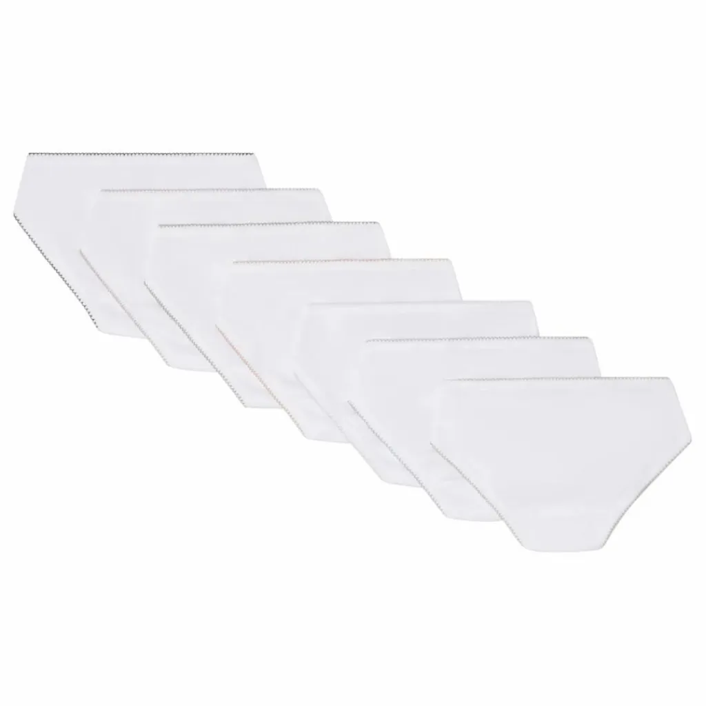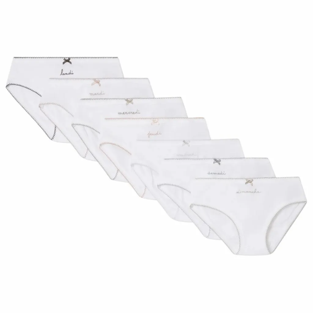 - En coton uni, les sept culottes pour fille de ce lot sont ornées d’une broderie jour de la semaine à l’avant. Chacune se décore d’un nœud satiné et d’une finition à picots de couleur assortie. En cotonTaille basseColoris assortis
