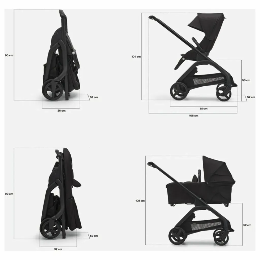 Pliage en 1 élément avec nacelle : Longueur : 32 cm, Largeur : 52 cm, Hauteur : 90 cmDimensions poussette dépliée : Longueur : 106 cm, Largeur : 52 cm, Hauteur : 104 cm