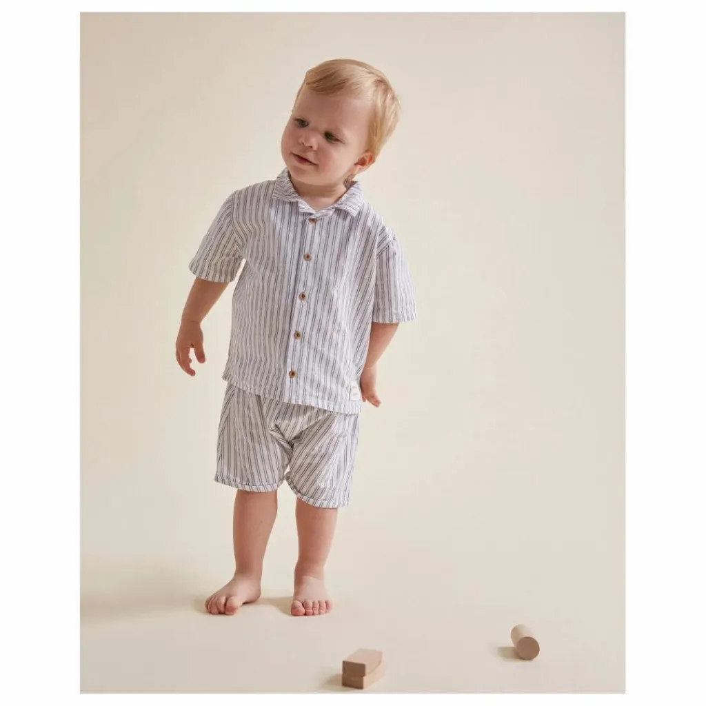 - Short rayé. Taille élastiquée avec cordon de serrage. Ourlet retourné. Étiquette décorative et poche arrière.