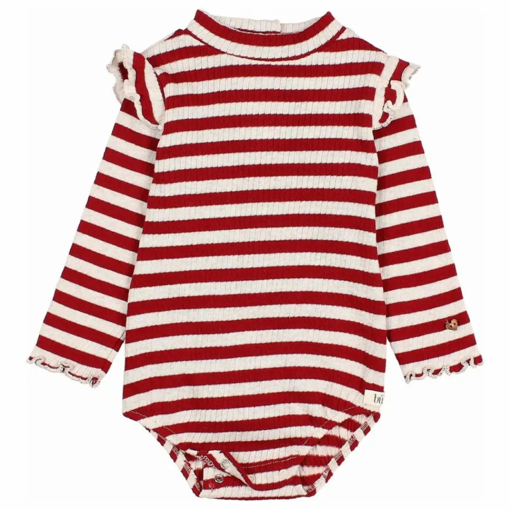 - Body rayé et côtelé. Volants sur les épaules. Encolure ronde avec fermeture goutte d’eau au dos. Boutons-pression à l’entrejambe pour faciliter l’habillage. Poignets élastiques. Coeur en bois sur la manchette.
