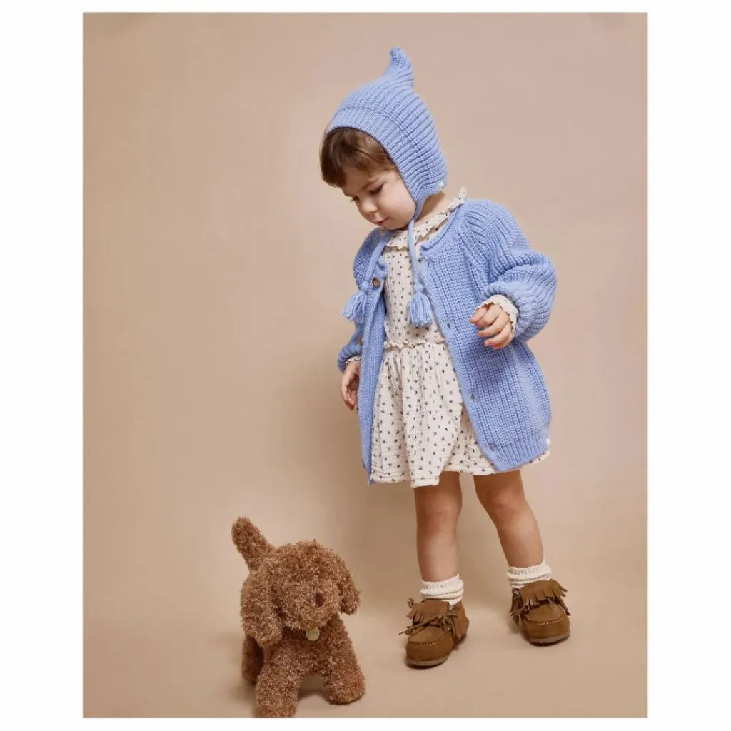 - Cardigan en maille douce. Col rond. Fermeture par boutons en bois sur le devant. Poignets et ourlets côtelés. Étiquette sur l’ourlet.