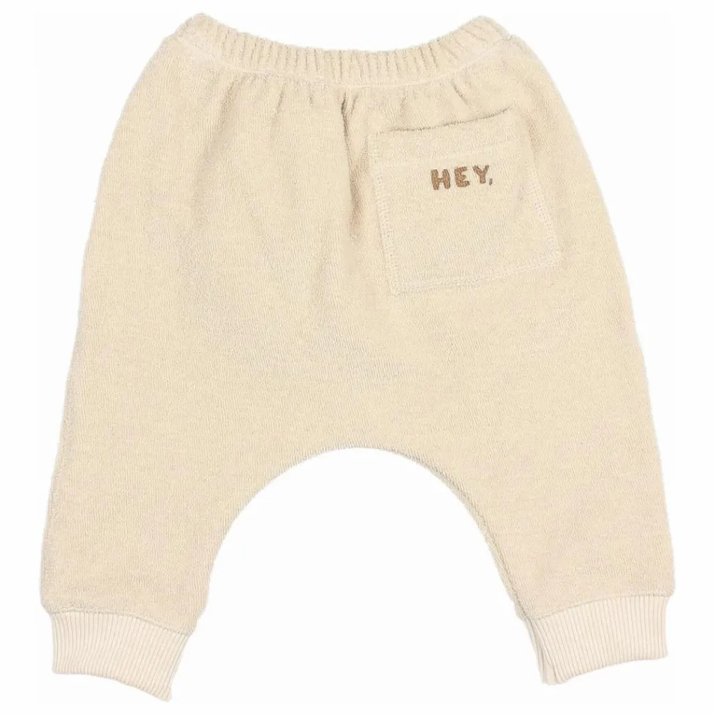 - Pantalon en éponge. Ceinture élastique. Poignets côtelés. Poche plaquée imprimée au dos. Étiquette sur la ceinture.